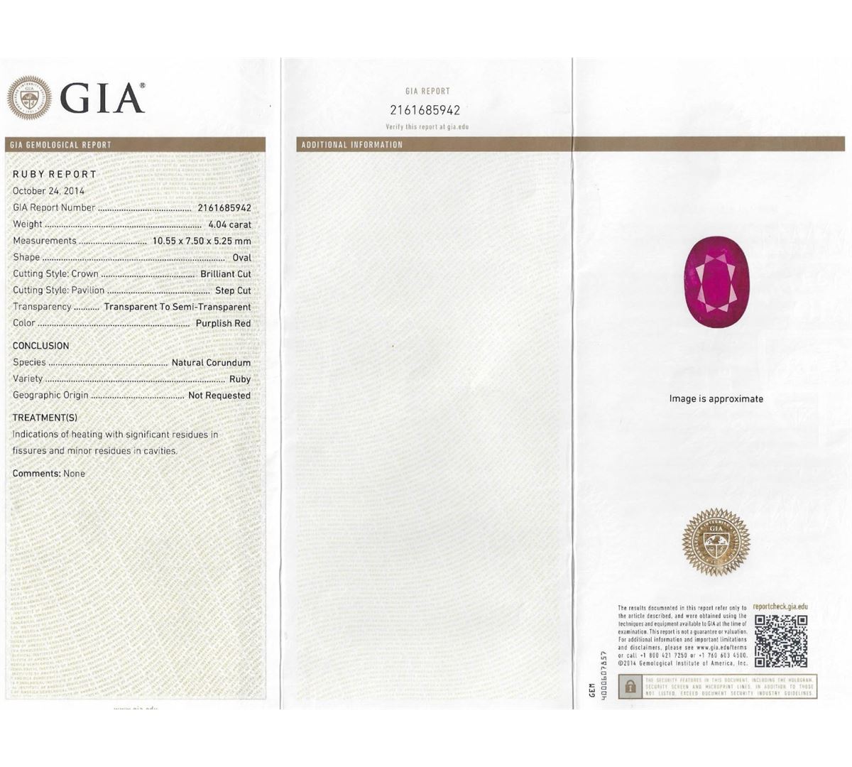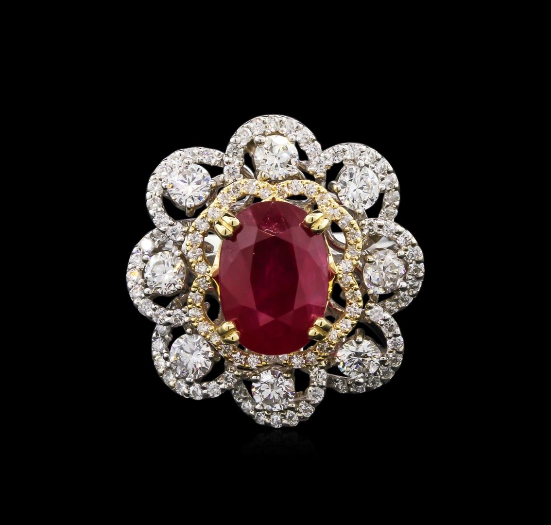 One electronically tested 14KT white and yellow gold lady's combination cast & assembled fashion ring with a bright polish finish. The featured lady's ring has a scalloped halo motif and a shank measuring 3.46 millimeters wide. Identified with markings of "K14". Condition is new, good workmanship. Containing: One prong set oval modified brilliant cut natural ruby, measuring 10.55 x 7.50 x 5.25mm, 15% bulge factor, approximate weight of 4.04ct., clarity is moderately included, type II, medium dark, moderately strong, slightly purplish red color, (GIA slpR 6/4), cut is very good. Transmitting light somewhat diffusely, semi-transparent to transparent. Indications of laboratory high temperature heat treatment, with significant residues in fissures and minor residues in cavities. Graded loose prior to setting in the GIA Laboratory, Report #2161685942.Eight prong set round brilliant cut diamonds, measuring 3.20 - 3.10 x 1.95mm (depth est.) approximate total weight of 8 Stones = 0.95ct. Graded in the setting. Clarity: SI-1 to SI-2. Color: H - J. Cut Very Good Sixty-Four prong set round brilliant cut diamonds, measuring 1.20 - 1.15 x 0.71mm (depth est.) approximate total weight of 64 Stones = 0.38ct. Graded in the setting. Clarity: VS-2 to SI-2. Color: H - I. Cut Good Thirty-Six prong set round brilliant cut diamonds, measuring 1.00 - 0.95 x 0.59mm (depth est.) approximate total weight of 36 Stones = 0.12ct. Graded in the setting. Clarity: SI-1 to SI-2. Color: H - I. Cut Good. Total Weight of Colored Stones 4.04ct. Total Weight of Diamonds 1.45ct. Total Weight of Ring 8.60gm. GAS Appraised at $16,295.00.