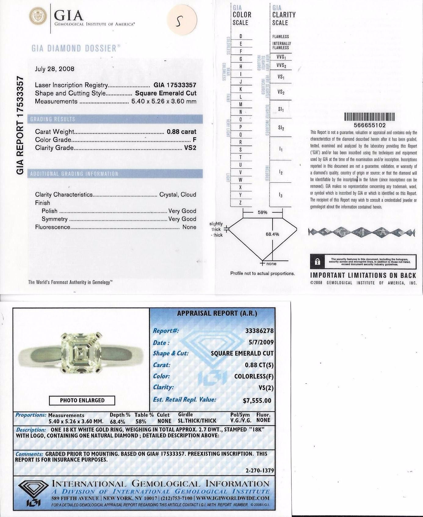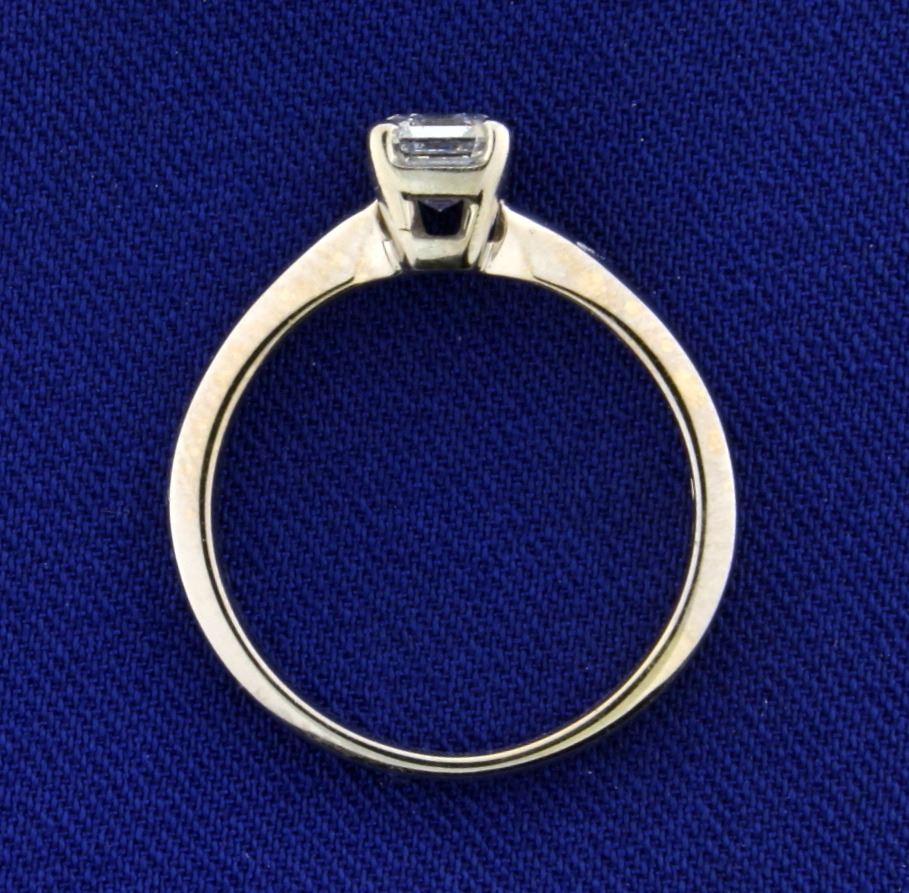 In 18k yellow gold. Diamond is a very high quality square diamond emerald cut diamond with VS2 clarity and F color, very good cut. Size 7 1/2. 3.7 g.