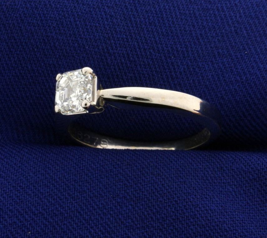 In 18k yellow gold. Diamond is a very high quality square diamond emerald cut diamond with VS2 clarity and F color, very good cut. Size 7 1/2. 3.7 g.