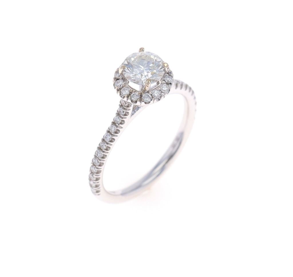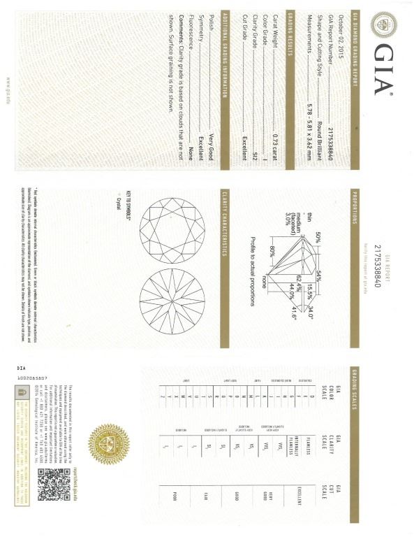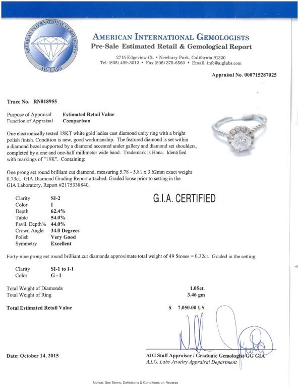 Featured in this lot GIA certified diamond and 18k white gold unity ring with AIG and GIA paperwork. The ring features a electronically tested 18k white gold ladies cast unity ring tha tis in good condition with great workmanship and features a raised lattice under gallery and shows a 'Hana' hallmark with a 18k gold stamp next to the hallmark. The center stone features a prong set round brilliant cut diamond with measurements of 5.78-5.81 x 3.62mm and shows a weight of 0.73ct with a clarity of SI2 and a color gradient of I. The center stone and shoulders are decorated with a total of 49 prong set round brilliant cut diamonds with a total weight of 0.32ct and are graded in setting with a clarity of SI1 to I1 and a color gradient of G-I. The piece comes complete with AIG(American International Gemologists, a GIA certified lab AIG Appraisal Number#: 000715287025) report and appraisal confirming the above info and giving a total value of $7,050.00. GIA (Gemological Institute of America) Diamond Grading Report#: 2175338840. The ring size is US 7.