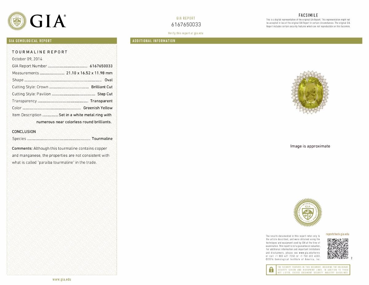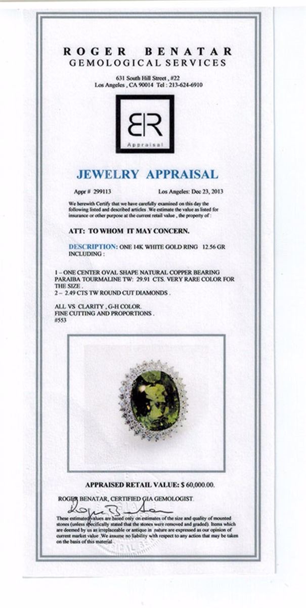 GIA Certified CENTER OVAL SHAPE NATURAL COPPER BEARING PARAIBA TOURMALINE TW: 29.91CTS, 2.49CTS TW ROUND CUT DIAMONDS, 14K WG RING 12.56GR