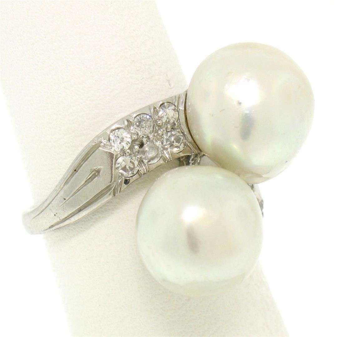 One GIA Certified Antique Solid Platinum Large Pearl & Diamond Bypass Cocktail Ring. Item Details: Material: .900 Solid Platinum, Weight: 11.50 Grams, Stone(s): (2) Natural Genuine Cultured Pearls - ** See Certification Details Below for Complete Info **, (11) Natural Genuine Diamonds - Round Single Cut - Pave Set - G-H Color - VS2-SI1 Clarity 0.30ctw (approx.), Total Carat Weight: 0.30ctw (approx.), Ring Size: 6.5, Ring Width: 21mm at its widest (where the pearls are), Ring Height: 11.75mm rise off the finger at its very highest, Condition: Original finish preserved. Pearls are Perfect and diamonds are secure. Certification Details Laboratory: GIA, Report Number: 1176402030, Stone Type: Cultured Saltwater Pearls from the Pinctada Maxima Mollusk. Stone Shape: Semi-Baroque. Dimensions: A-11.18x10.88mm and B-12.24x11.12mm, Color: White with Orient Overtone