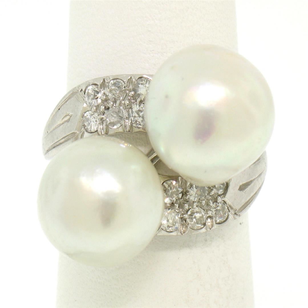 One GIA Certified Antique Solid Platinum Large Pearl & Diamond Bypass Cocktail Ring. Item Details: Material: .900 Solid Platinum, Weight: 11.50 Grams, Stone(s): (2) Natural Genuine Cultured Pearls - ** See Certification Details Below for Complete Info **, (11) Natural Genuine Diamonds - Round Single Cut - Pave Set - G-H Color - VS2-SI1 Clarity 0.30ctw (approx.), Total Carat Weight: 0.30ctw (approx.), Ring Size: 6.5, Ring Width: 21mm at its widest (where the pearls are), Ring Height: 11.75mm rise off the finger at its very highest, Condition: Original finish preserved. Pearls are Perfect and diamonds are secure. Certification Details Laboratory: GIA, Report Number: 1176402030, Stone Type: Cultured Saltwater Pearls from the Pinctada Maxima Mollusk. Stone Shape: Semi-Baroque. Dimensions: A-11.18x10.88mm and B-12.24x11.12mm, Color: White with Orient Overtone