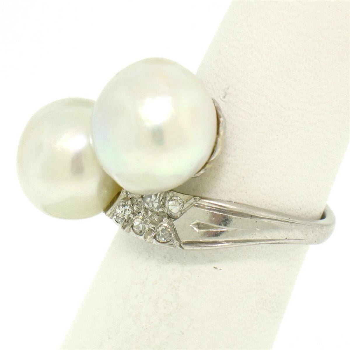 One GIA Certified Antique Solid Platinum Large Pearl & Diamond Bypass Cocktail Ring. Item Details: Material: .900 Solid Platinum, Weight: 11.50 Grams, Stone(s): (2) Natural Genuine Cultured Pearls - ** See Certification Details Below for Complete Info **, (11) Natural Genuine Diamonds - Round Single Cut - Pave Set - G-H Color - VS2-SI1 Clarity 0.30ctw (approx.), Total Carat Weight: 0.30ctw (approx.), Ring Size: 6.5, Ring Width: 21mm at its widest (where the pearls are), Ring Height: 11.75mm rise off the finger at its very highest, Condition: Original finish preserved. Pearls are Perfect and diamonds are secure. Certification Details Laboratory: GIA, Report Number: 1176402030, Stone Type: Cultured Saltwater Pearls from the Pinctada Maxima Mollusk. Stone Shape: Semi-Baroque. Dimensions: A-11.18x10.88mm and B-12.24x11.12mm, Color: White with Orient Overtone