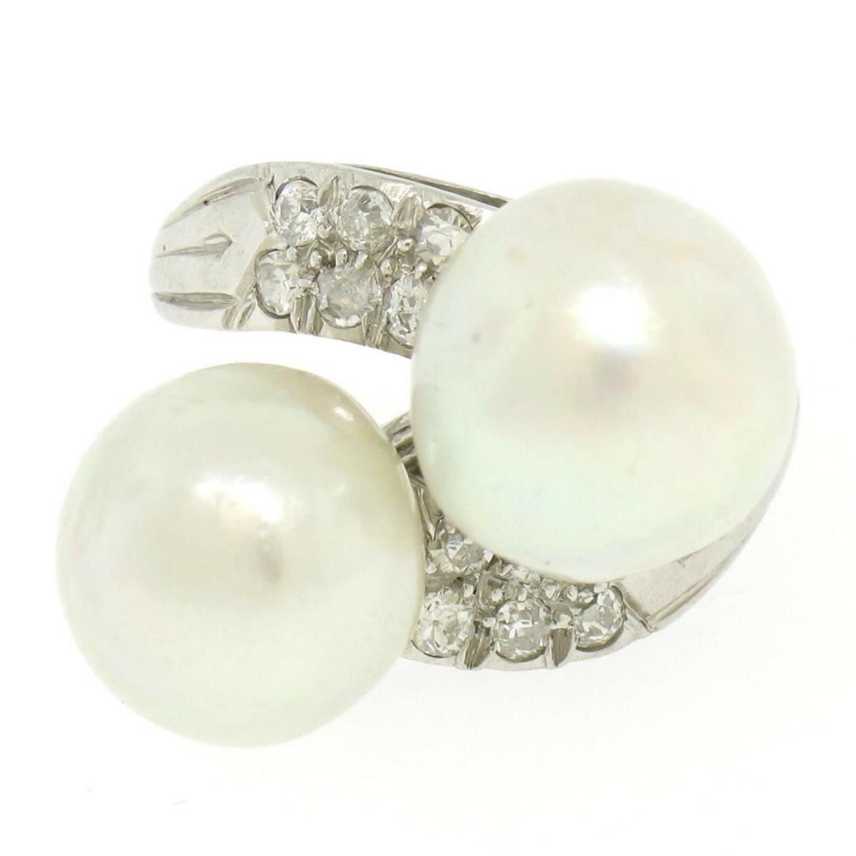 One GIA Certified Antique Solid Platinum Large Pearl & Diamond Bypass Cocktail Ring. Item Details: Material: .900 Solid Platinum, Weight: 11.50 Grams, Stone(s): (2) Natural Genuine Cultured Pearls - ** See Certification Details Below for Complete Info **, (11) Natural Genuine Diamonds - Round Single Cut - Pave Set - G-H Color - VS2-SI1 Clarity 0.30ctw (approx.), Total Carat Weight: 0.30ctw (approx.), Ring Size: 6.5, Ring Width: 21mm at its widest (where the pearls are), Ring Height: 11.75mm rise off the finger at its very highest, Condition: Original finish preserved. Pearls are Perfect and diamonds are secure. Certification Details Laboratory: GIA, Report Number: 1176402030, Stone Type: Cultured Saltwater Pearls from the Pinctada Maxima Mollusk. Stone Shape: Semi-Baroque. Dimensions: A-11.18x10.88mm and B-12.24x11.12mm, Color: White with Orient Overtone