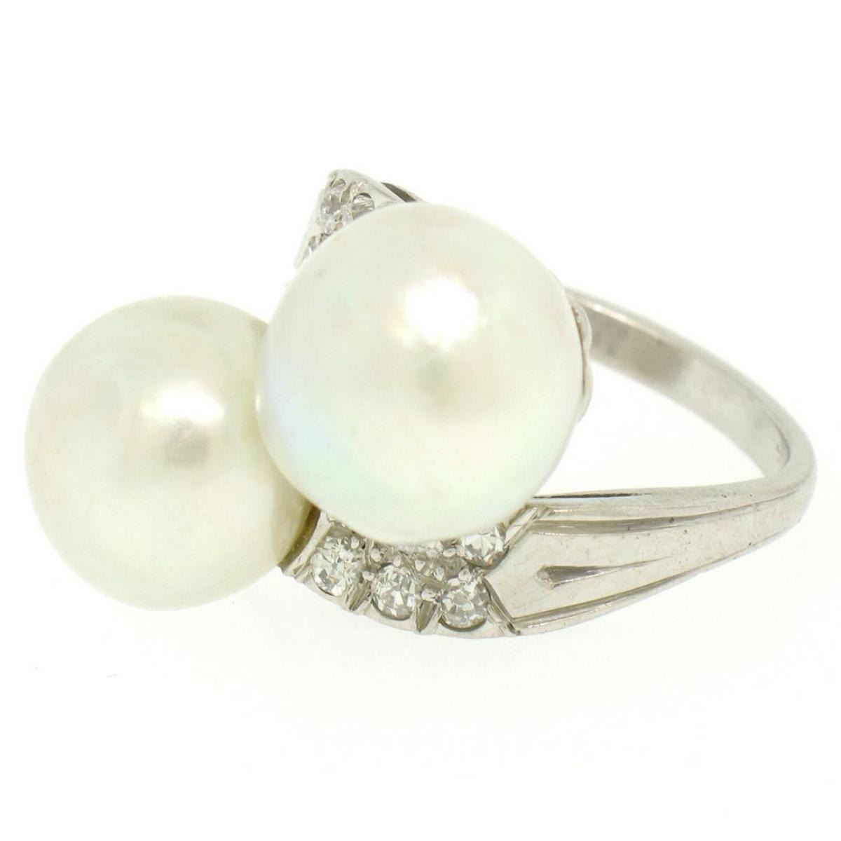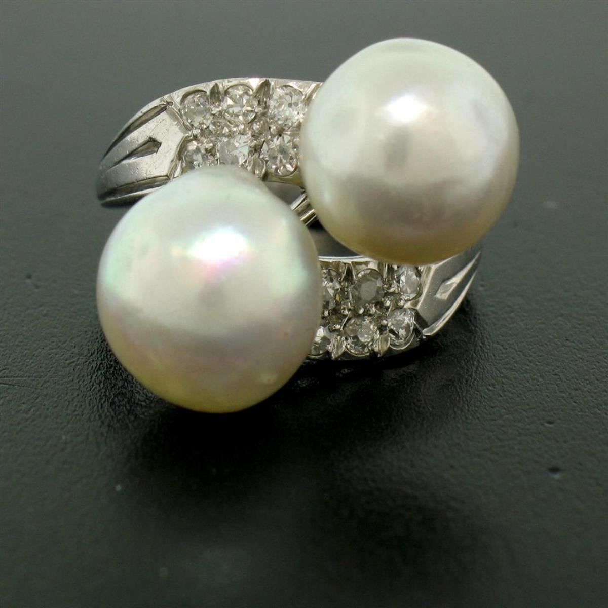One GIA Certified Antique Solid Platinum Large Pearl & Diamond Bypass Cocktail Ring. Item Details: Material: .900 Solid Platinum, Weight: 11.50 Grams, Stone(s): (2) Natural Genuine Cultured Pearls - ** See Certification Details Below for Complete Info **, (11) Natural Genuine Diamonds - Round Single Cut - Pave Set - G-H Color - VS2-SI1 Clarity 0.30 ctw (approx.), Total Carat Weight: 0.30 ctw (approx.), Ring Size: 6.5, Ring Width: 21mm at its widest (where the pearls are), Ring Height: 11.75mm rise off the finger at its very highest, Condition: Original finish preserved. Pearls are Perfect and diamonds are secure. Certification Details Laboratory: GIA, Report Number: 1176402030, Stone Type: Cultured Saltwater Pearls from the Pinctada Maxima Mollusk. Stone Shape: Semi-Baroque. Dimensions: A-11.18x10.88mm and B-12.24x11.12mm, Color: White with Orient Overtone