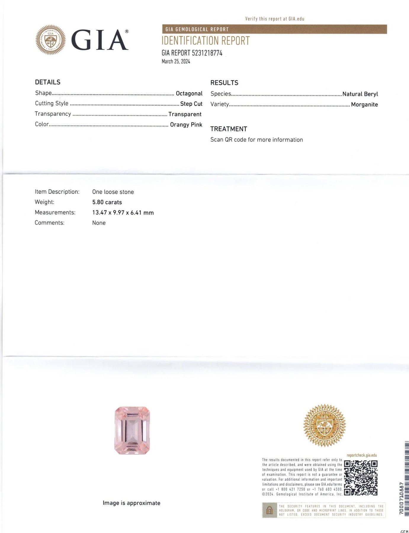 This Gorgeous Large 5.8 Ct VVs1 Natural Pink Morganite Is a Fine Emerald Cut measuring 13.47 x 9.97 x 6.41 mm. This Investment Grade Morganite has the highly desired pinkish orange hue along with full even saturation. Morganite is in the Beryl Family and is often referred to as the " RosePink Emerald". Treatment: None. Origin; Brazil. Please see the certification for further details.