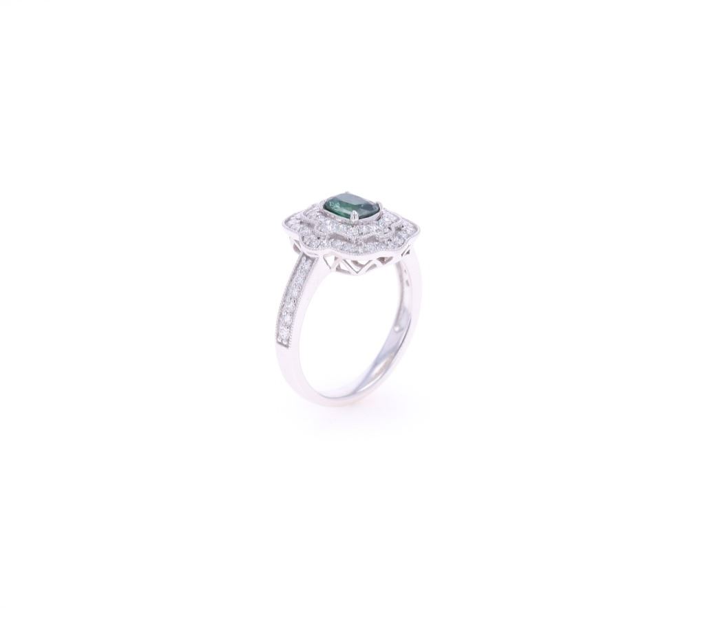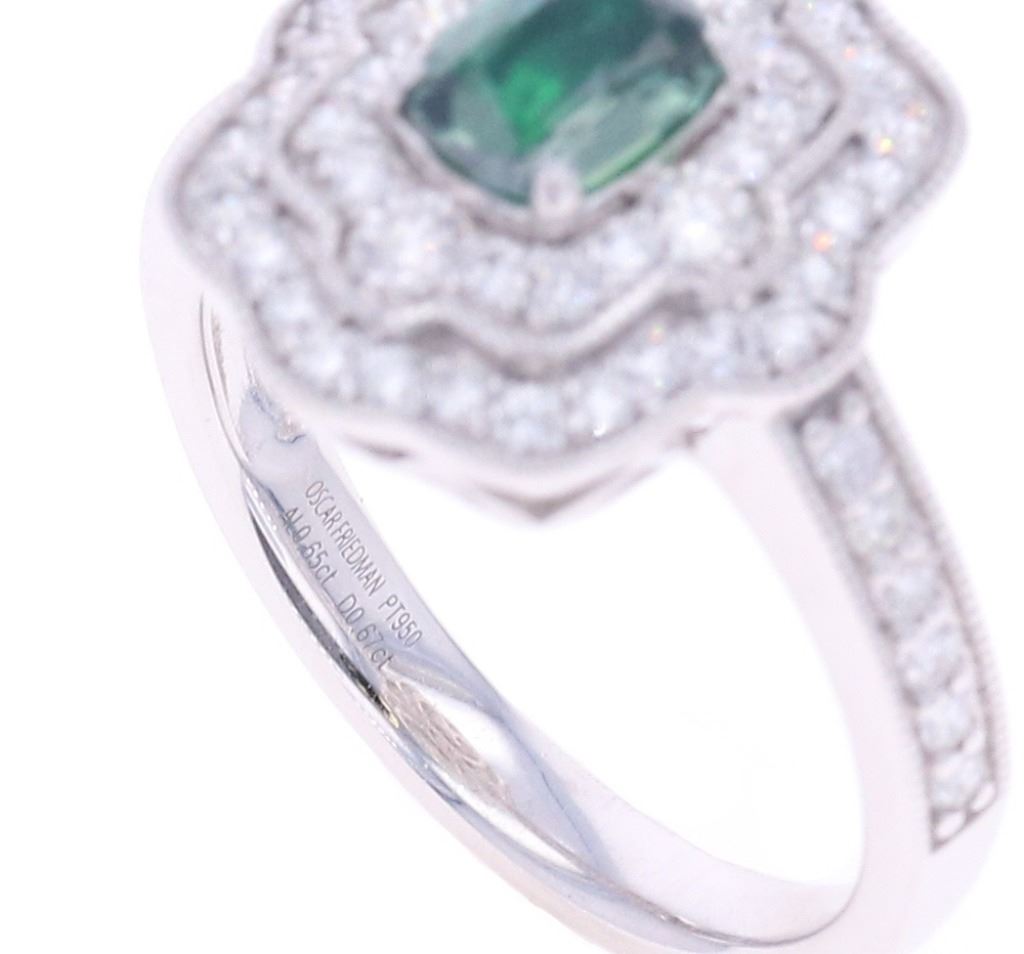 Featured in this lot is this GIA color change Alexandrite VS1 diamond platinum ring with GIA and AIGL paperwork. The ring features a polished, stamped, and tested platinum construction that is marked as follows: Oscar Friedman - PT950. The ring features a center stone of cushion brilliant cut crown with a step cut pavilion natural alexandrite with measurements of 5.95 x 4.56 x 2.51mm with green coloration and color changes to purple with a total weight of 0.65cts. The raised lattice around the ring is decorated with a total of 56 round brilliant cut diamonds that shows measurements of 1.3 - 2mm and shows a clarity grade of VS1 to SI1 with a color gradient of F - G with a total diamond weight of 0.67cts. The piece comes complete with AIGL Inc.(American International Gemological Laboratories, Inc. a GIA certified lab AIGL#: K51E99-EA20672) report and appraisal confirming the above info and giving a total value of $16,376.00. GIA (Gemological Institute of America) Sapphire Grading Report#: 5234228901. The ring size is US 9 1/2.