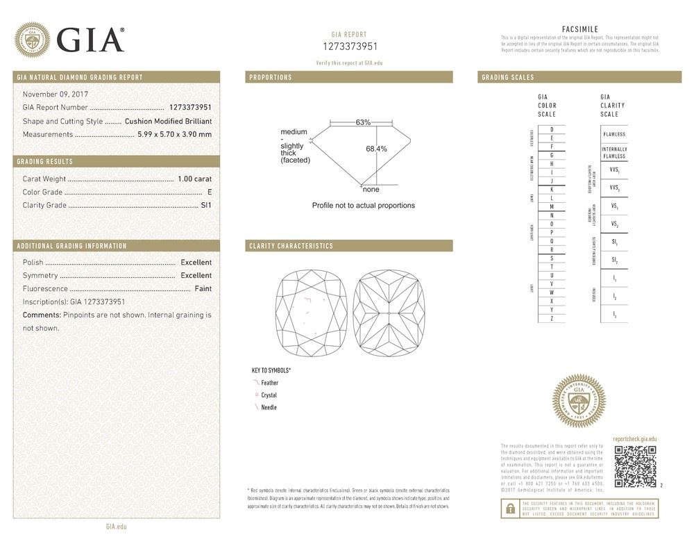 GIA/Cushion/E/SI1/1ct/-/EX/EX/Dimension - 5.99 x 5.7 x 3.9/GIA# 1273373951/#F66012
