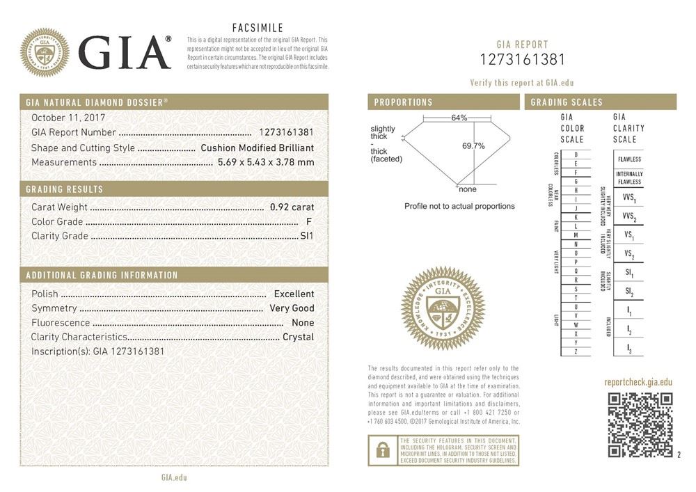 GIA/Cushion/F/SI1/0.92ct/-/EX/VG/Dimension - 5.69 x 5.43 x 3.78/GIA# 1273161381/#F65342