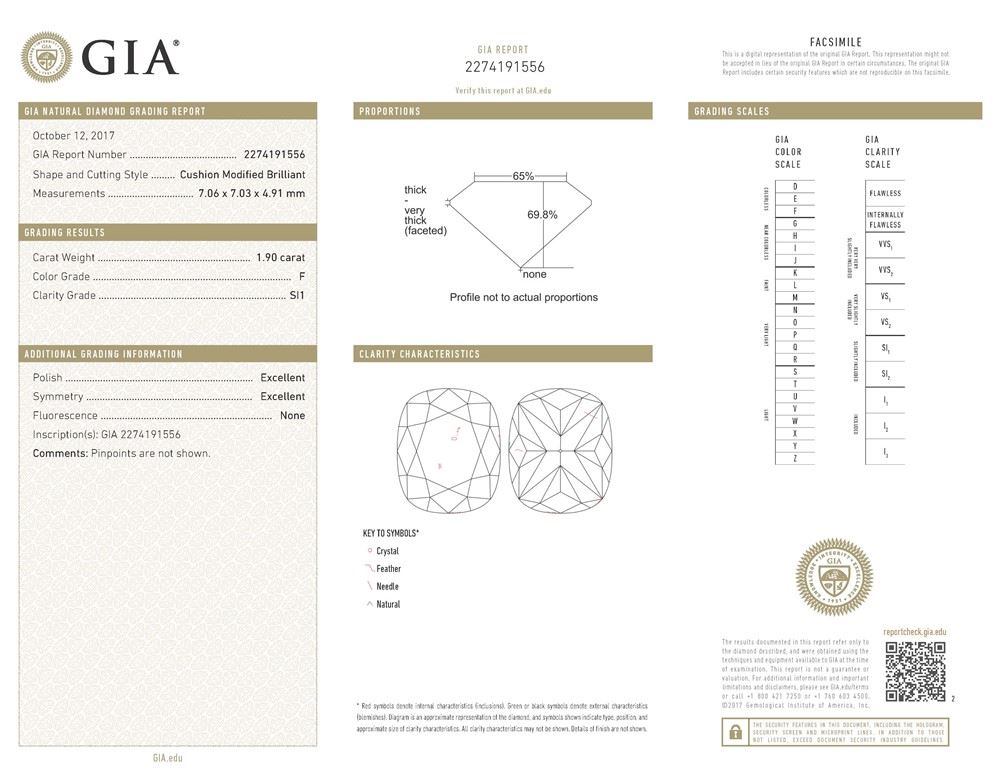 GIA/Cushion/F/SI1/1.9ct/-/EX/EX/Dimension - 7.06 x 7.03 x 4.91/GIA# 2274191556/#F65530