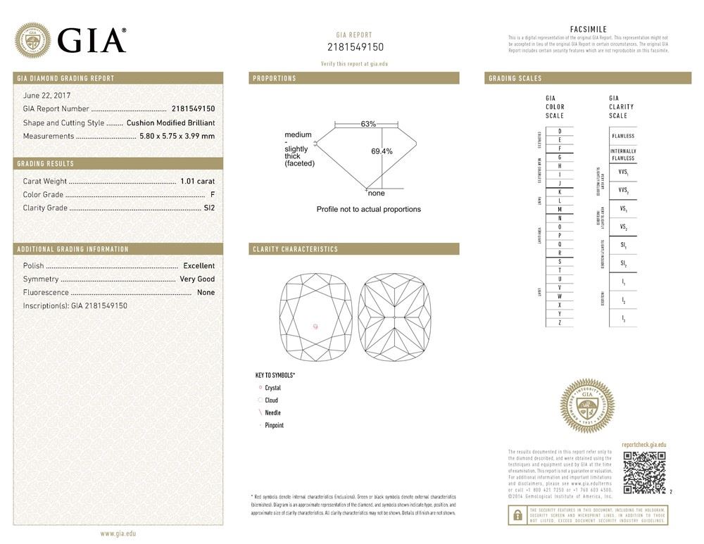 GIA/Cushion/F/SI2/1.01ct/-/EX/VG/Dimension - 5.8 x 5.75 x 3.99/GIA# 2181549150/#F62636