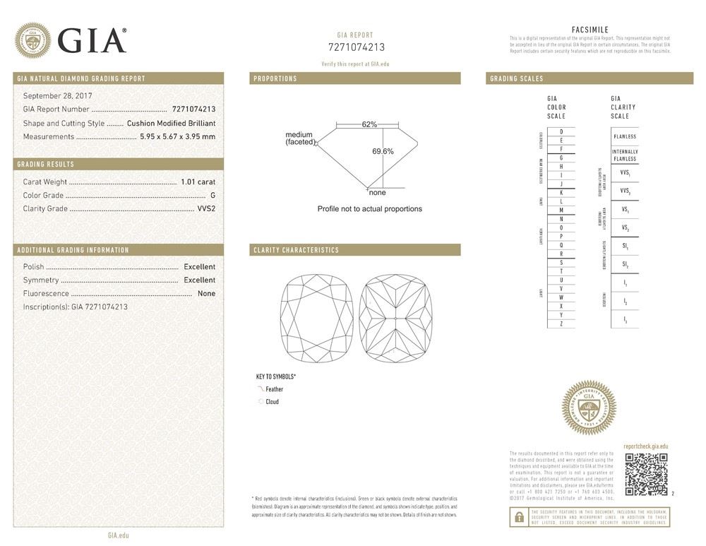 GIA/Cushion/G/VVS2/1.01ct/-/EX/EX/Dimension - 5.95 x 5.67 x 3.95/GIA# 7271074213/#F65150