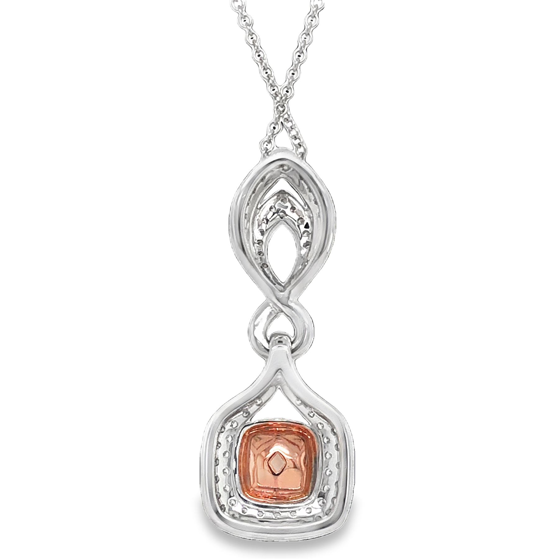 DESCRIPTION DETAIL: A gorgeous pendant featuring a natural Faint Pink cushion cut Diamond with a halo of Fancy Light Pink Diamonds and a double halo of natural round brilliant colorless Diamonds set in 18k White and Rose Gold. Additional round brilliant cut colorless Diamonds accent the bail.