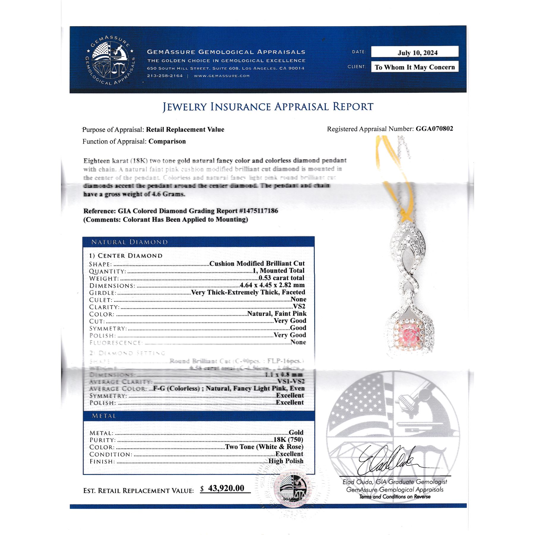TITLE DESCRIPTION: GIA Faint Pink & amp; Colorless Diamond Pendant