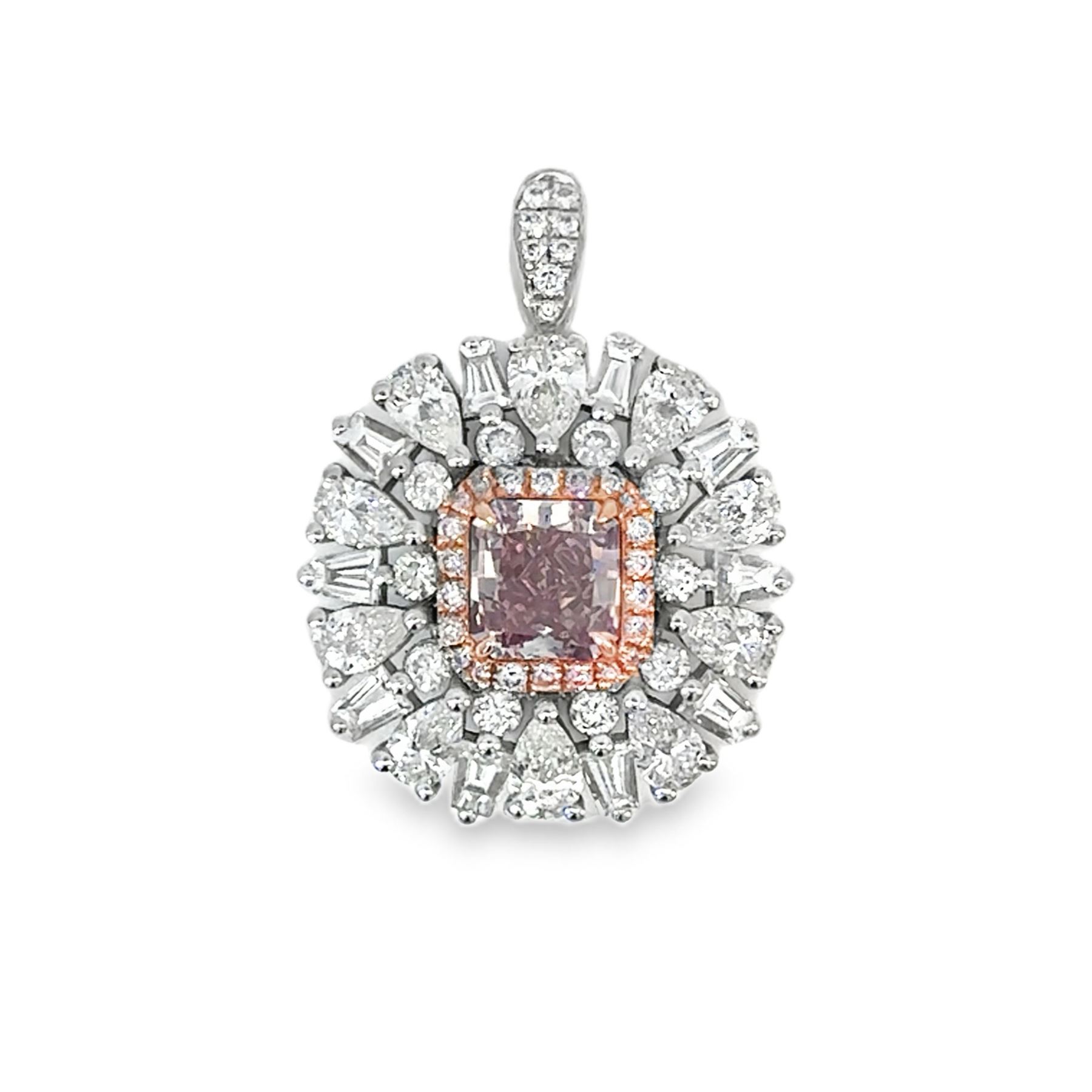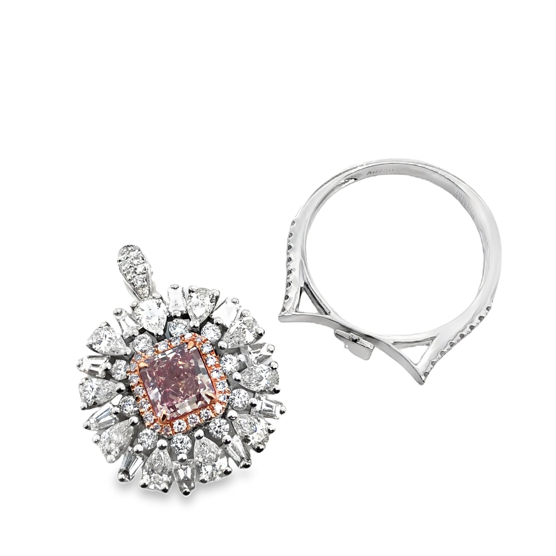 DESCRIPTION DETAIL: A gorgeous conversion piece, this ring converts into a pendant. The cushion cut natural Fancy Brownish Pink Diamond is surrounded by a halo of round brilliant cut natural Light Pink Diamonds. Pear shape, round brilliant, and tapered baguette natural colorless Diamonds complete the look, lining the outside of the ring/pendant.& nbsp;