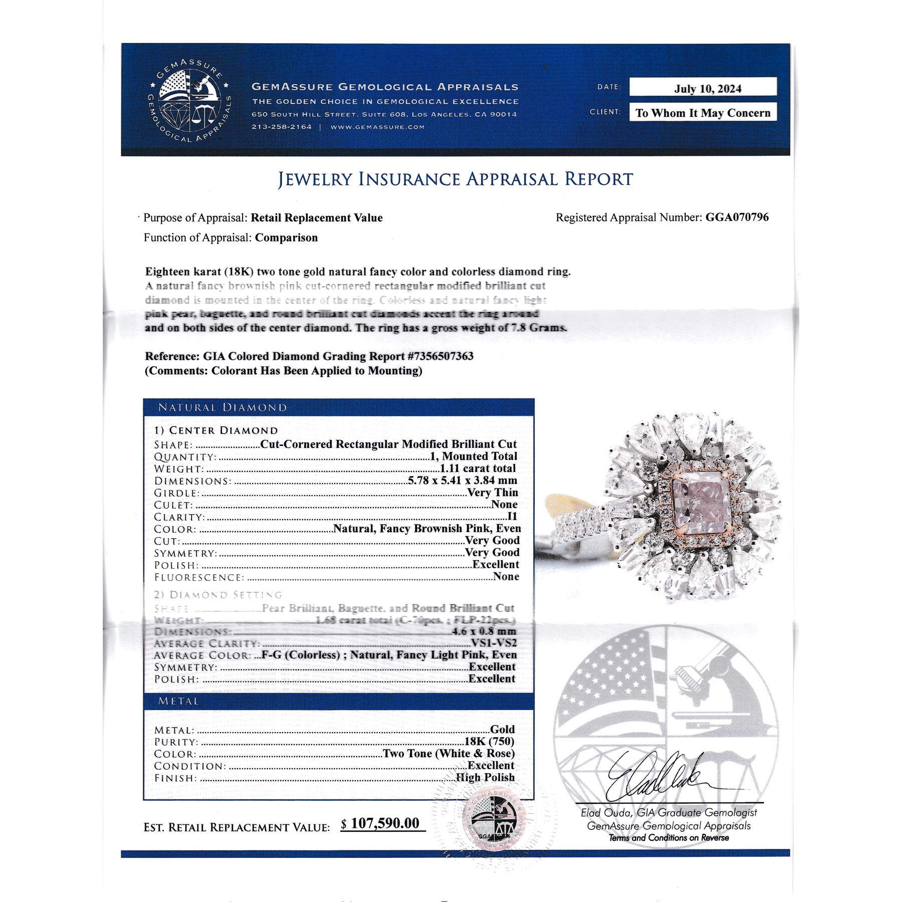 APPRAISAL REPORT: GIA graded & amp; GGA appraised this item with an estimated retail replacement value of $107,590.00.