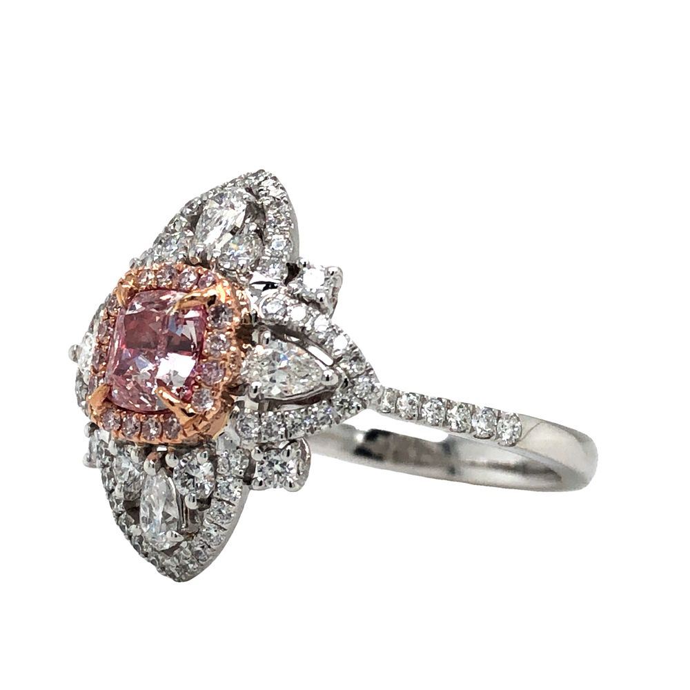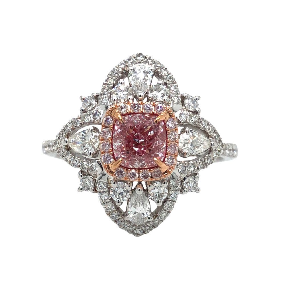 DESCRIPTION DETAIL: A gorgeous ring featuring a cushion cut natural Pink Diamond in the center surrounded by a halo of round brilliant cut natural Light Pink Diamonds set in 18k Rose Gold. Colorless round brilliant cut and pear shape natural Diamonds surround the center Pink Diamonds in a 18k White Gold floral design.