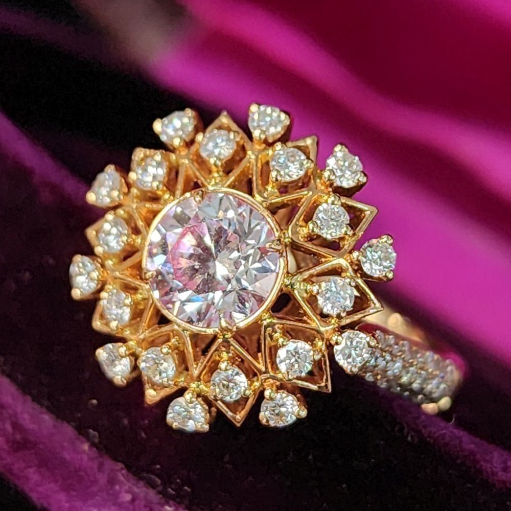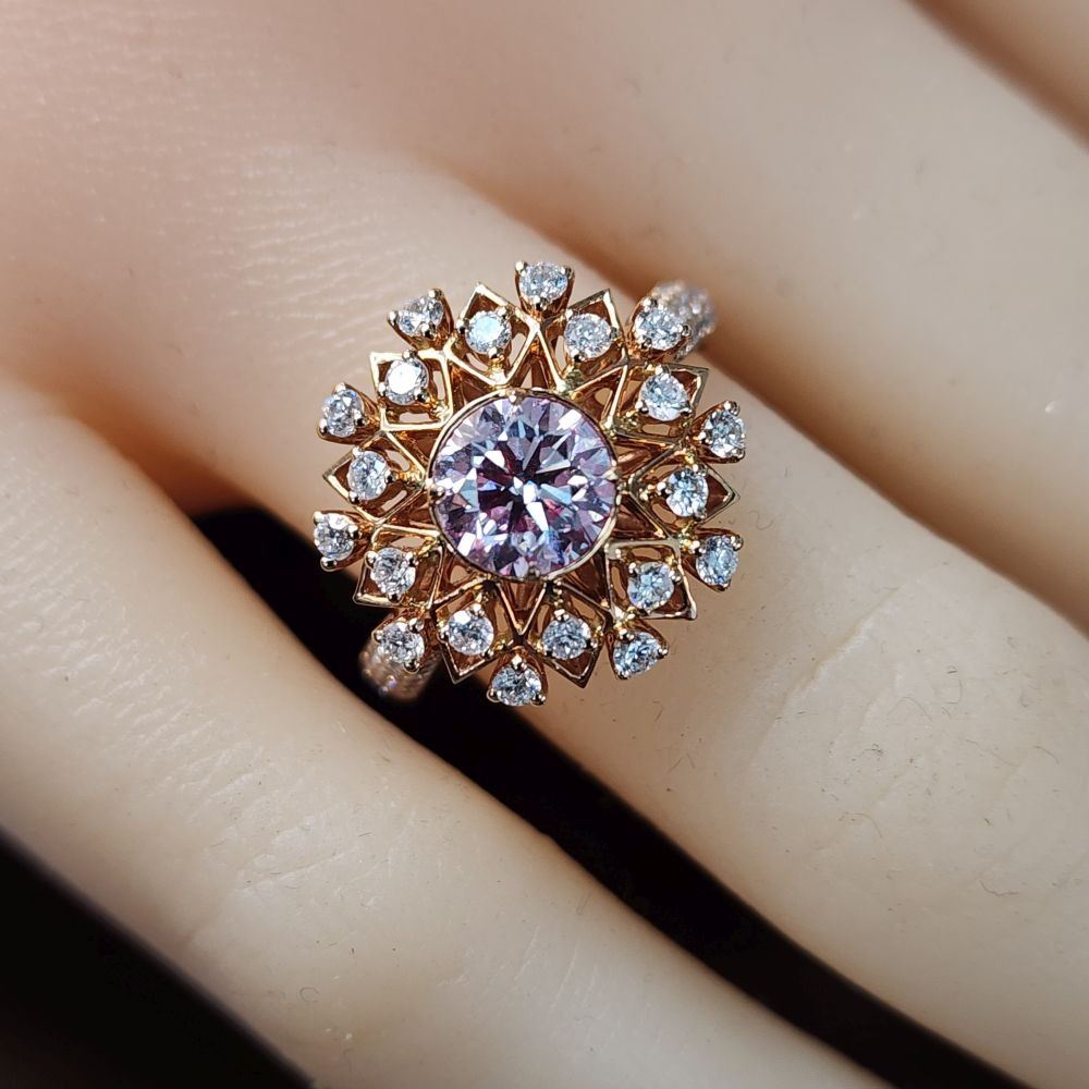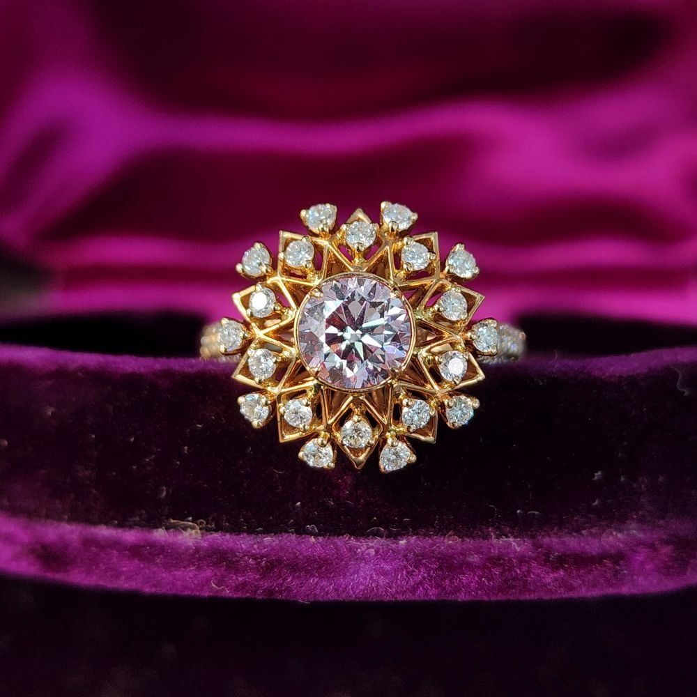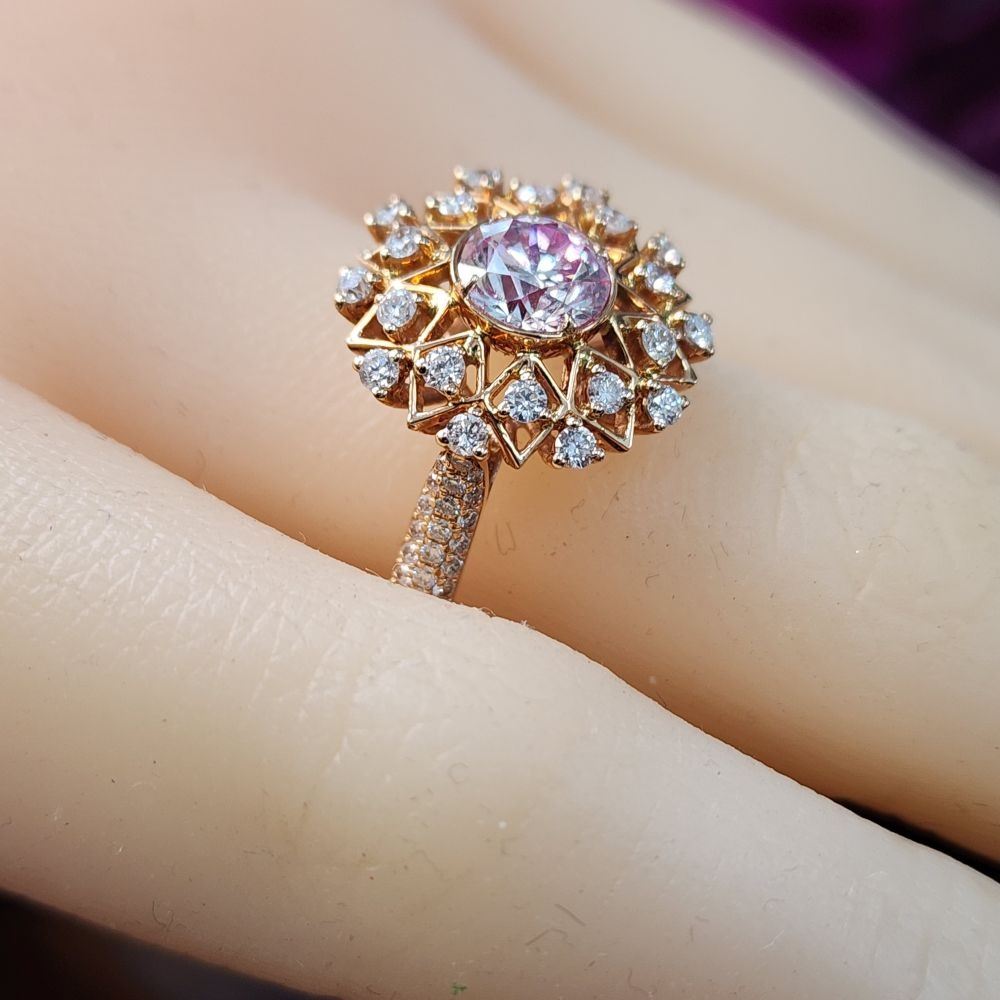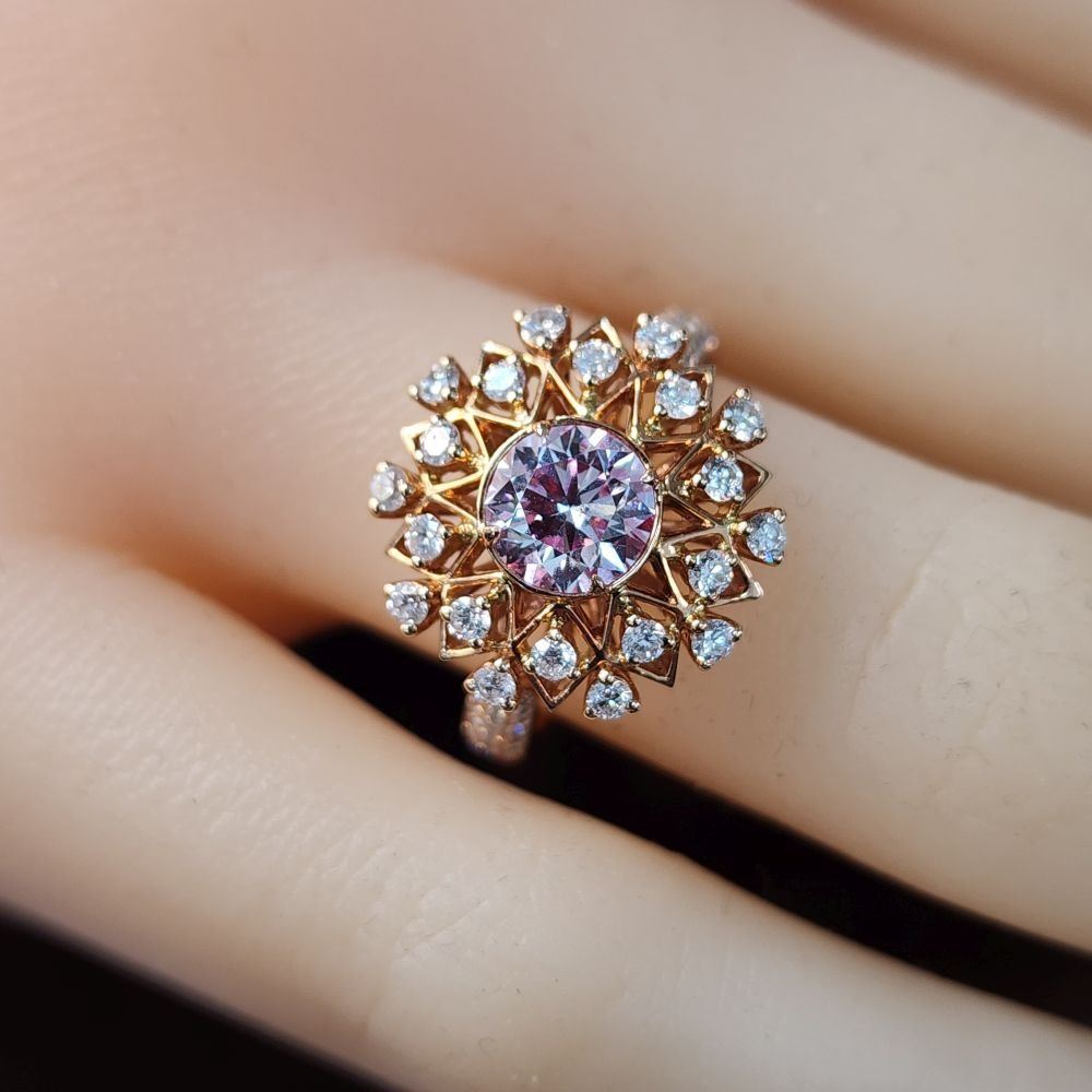 Fancy Color and Near Colorless Earth-Mined Diamond Ring.& nbsp; A GIA certified .90 carat round, brilliant-cut, natural faint pinkish brown color, SI1 clarity diamonds is bezel-set in 18 karat rose gold and secured with claw prongs and a bezel-cup.& nbsp; Surrounding the spectacular center diamond is .58 carats of round, brilliant-cut, F-G color, VS1- SI1 clarity diamonds in the raised shoulders and scattered halo that looks a splash of crystal clear water droplets!& nbsp; This ring is US size 6.5 and has an approximate 3 mm shank.& nbsp; This ring can be resized for an additional $100, please allow an additional 10 days for shipping if we resize it.& nbsp; This ring is certified and appraised for $28,390.00 estimated retail replacement value.& nbsp; The GIA Natural Colored Diamond Report number is laser inscribed on the polished and faceted girdle of the certified diamond.