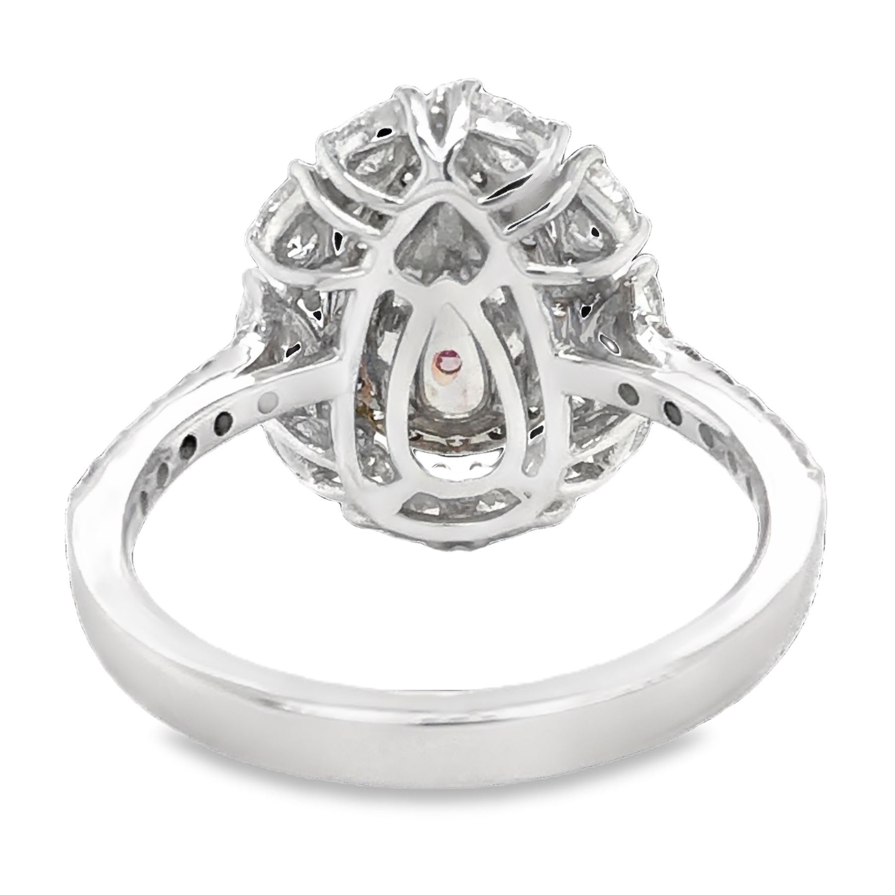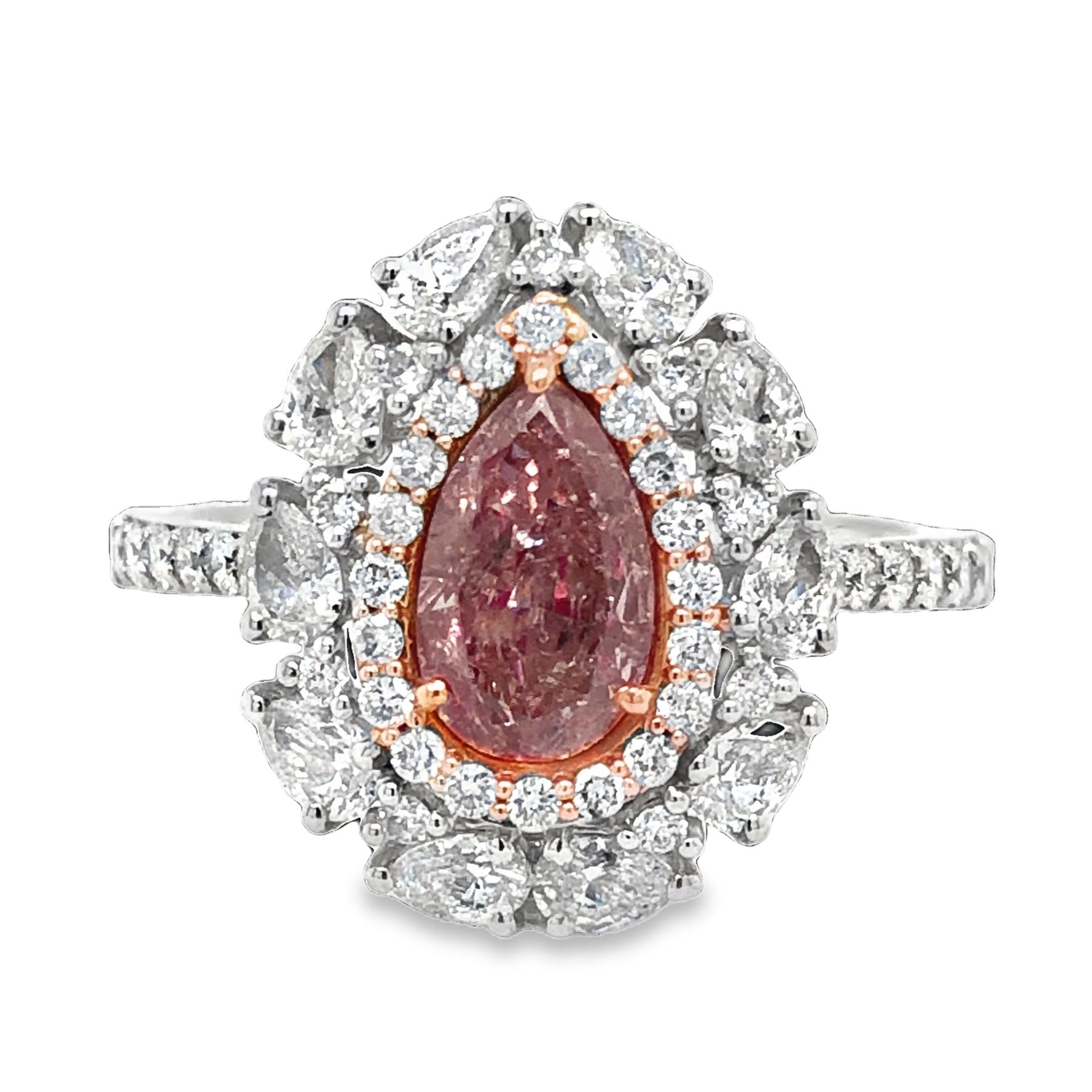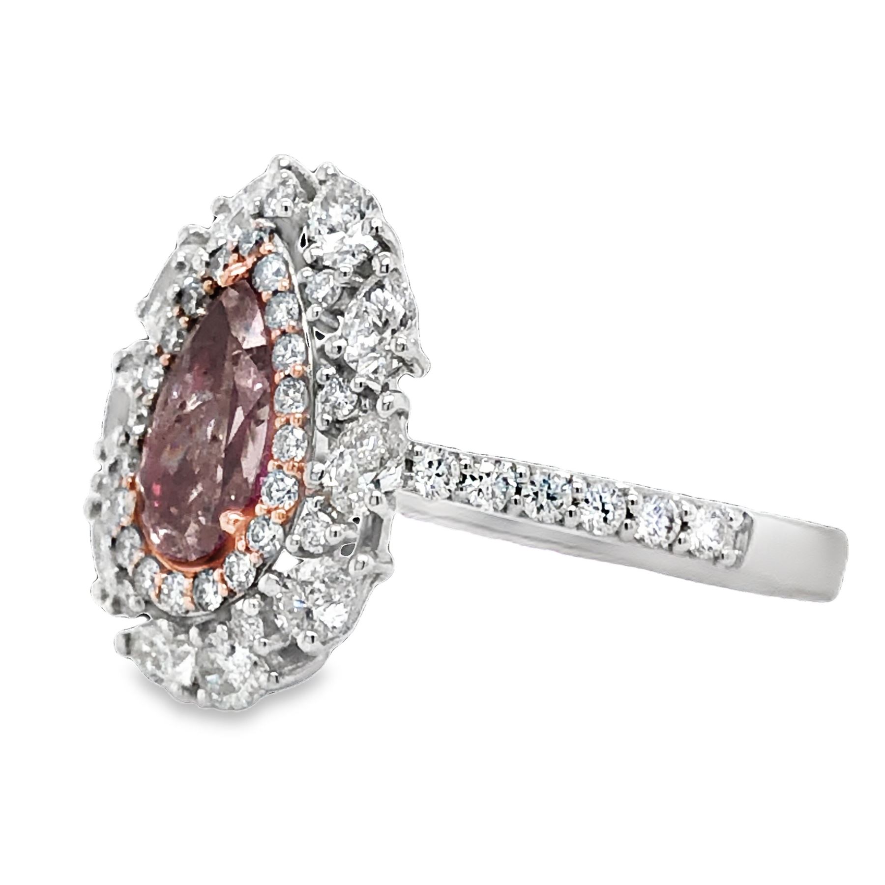 DESCRIPTION DETAIL:& nbsp; A gorgeous ring featuring a pear shape natural Fancy Brownish Pink Diamond surrounded by a halo of round brilliant cut and marquise cut colorless natural Diamonds set in 18k White and Rose Gold.