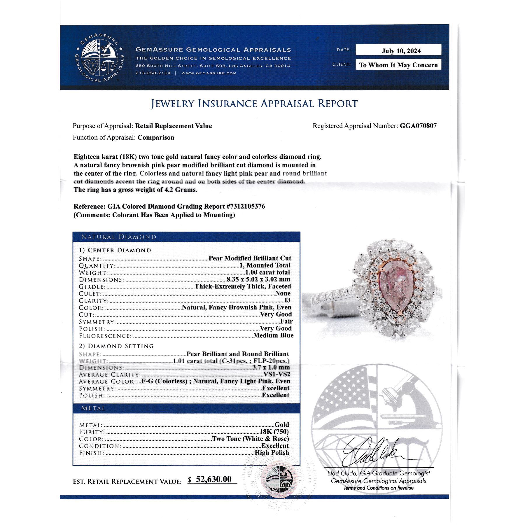 APPRAISAL REPORT: GIA graded & amp; GGA appraised this ring with an estimated retail replacement value of $103,460.00.