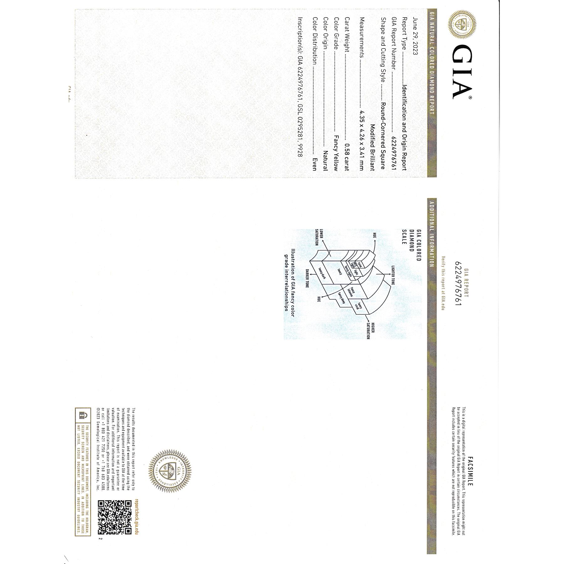PAD8554/3-TKT TITLE DESCRIPTION: GIA Fancy Yellow 0.58 CT SQ/CU Cut Loose Diamond DESCRIPTION DETAIL: A gorgeous loose Natural Fancy Yellow 0.58 Carat Cushion Cut Diamond described by GIA as follows. OVERALL CONDITION: Excellent DIAMOND: Natural Weight: 0.58 Carat Shape: Square Cut Modified Brilliant Color: Fancy Yellow Report: GIA #6224976761 Report shown in the photos. ADDITIONAL INFORMATION: This GIA certified Rounded-Cornered Square Modified Brilliant Cut, natural colored diamond is ready to set! With lots of fire and brilliance, this diamond will get noticed in any mounting. The GIA number is inscribed on the smooth, polished girdle. THIS ITEM IS FROM AN ORDERED LIQUIDATION OF A MAJOR JEWELRY MANUFACTURER'S OVERSTOCKED INVENTORY PRIOR TO BIDDING READ THE DESCRIPTION CAREFULLY This description and condition report is provided for your convenience based on the information provided by the consignor. Buyers Premium: 18% Shipping Billed Separately Payment Due in 5 days All items shipped to registered address - NO EXCEPTIONS PAD8554-3 / TKT