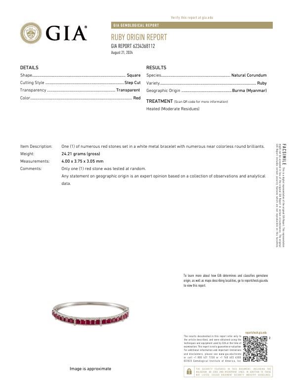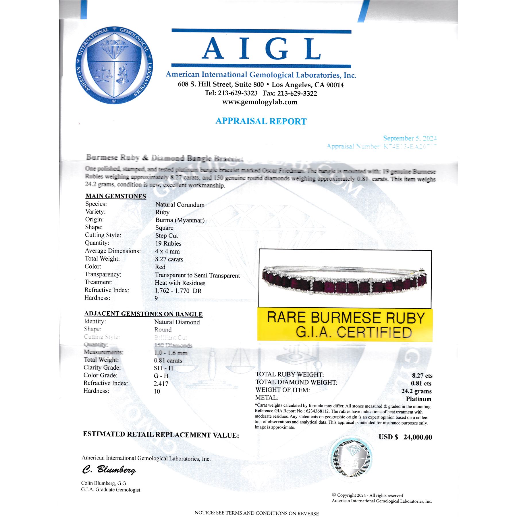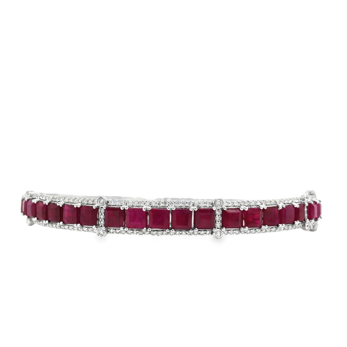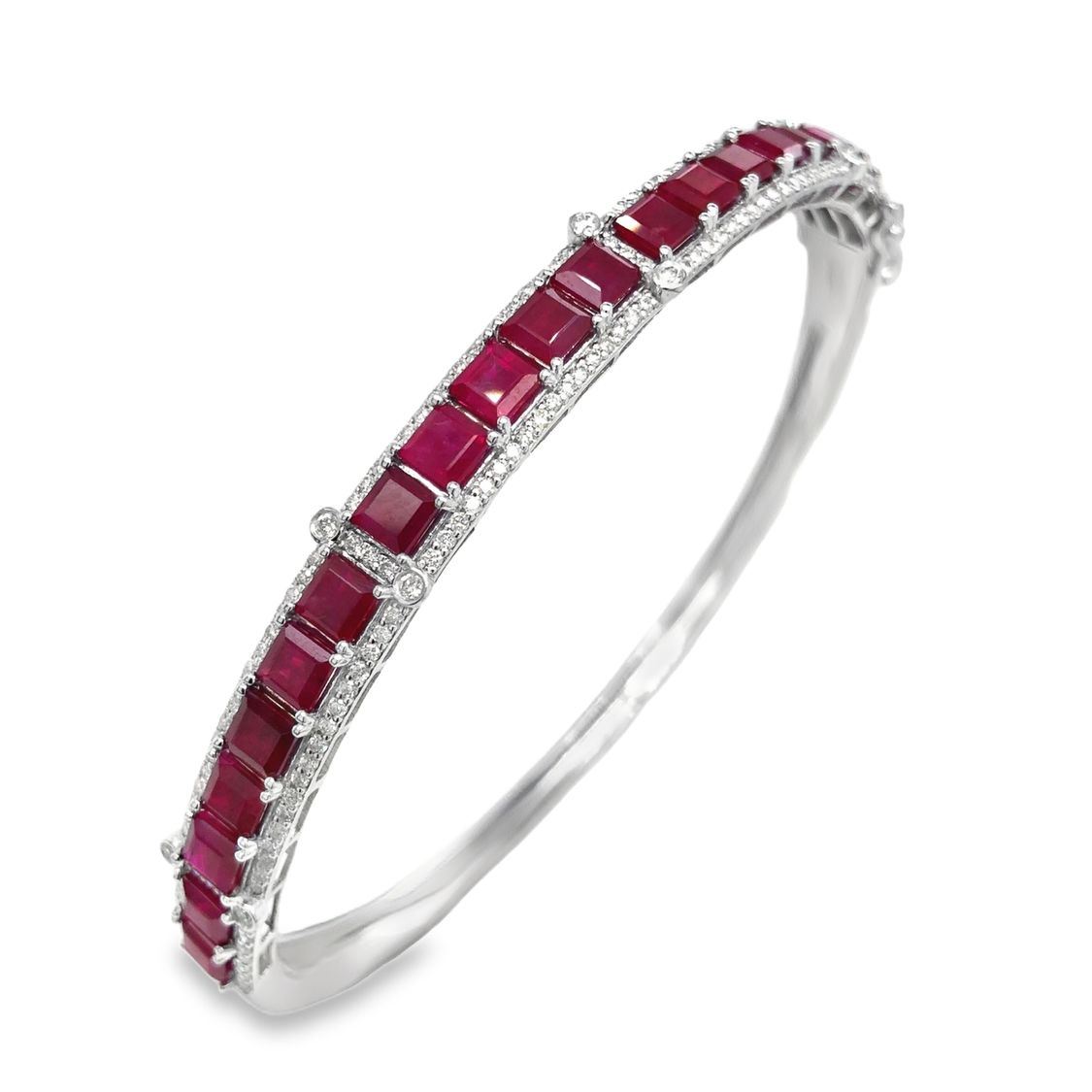 DESCRIPTION DETAIL: A beautiful bangle set with square step cut Burmese Rubies set among natural round brilliant cut Diamonds in Platinum.& nbsp;