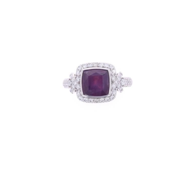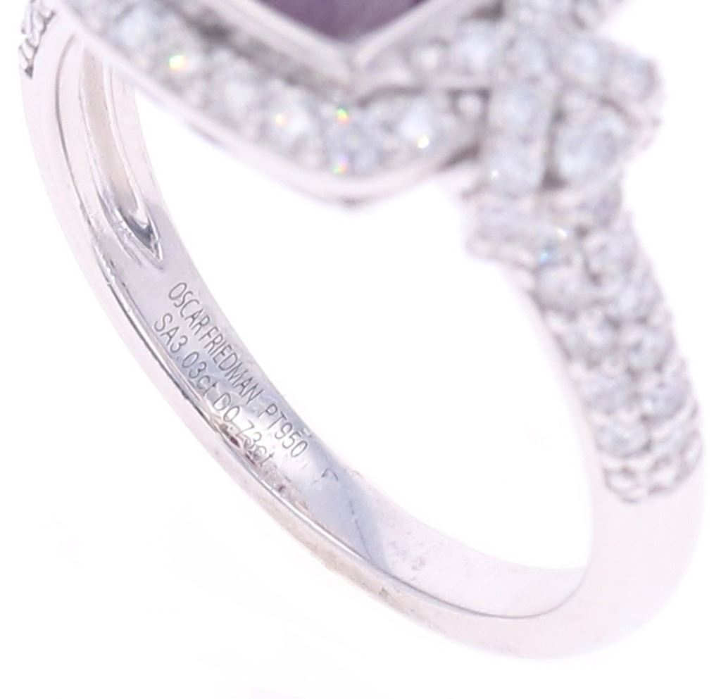 Featured in this lot is this GIA Kashmir Sapphire VS2 diamond and platinum ring with GIA and GGA paperwork. The ring features a polished, stamped, and tested platinum construction that is marked as follows: Oscar Friedman - PT950. The ring features a a center stone of natural cushion modified brilliant Kashmir Sapphire with no indication of heat treatment and measurements of 8.01 x 7.91 x 4.99mm and is type 3 clarity with purple pink 5/5 coloration and a total weight of 3.03ct. The center stone and intricate shoulders are decorated with a total of 74 round brilliant cut diamonds that shows measurements of 2.0 x 1.0mm that shows a clarity of VS1 - VS2 and a color grade of F - G and a total diamond weight of 0.73ct. The piece comes complete with GGA(GemAssure Gemological Appraisals, GGA Appraisal Number#: GGA070023 and trace number: RN036372) report and appraisal confirming the above info and giving a total value of $21,730.00. GIA (Gemological Institute of America) Sapphire Grading Report#: 6234178352. The ring size is US 7.