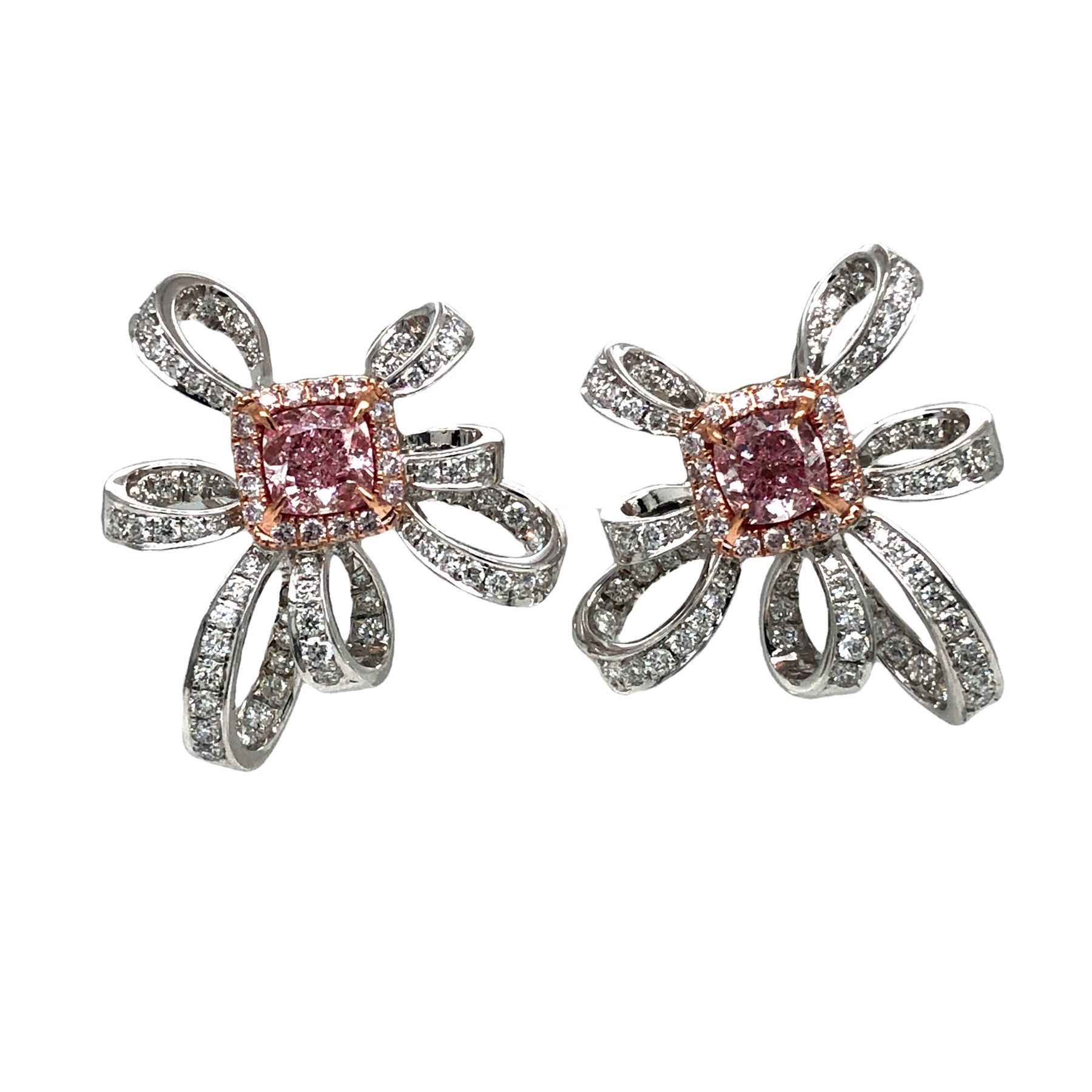 DESCRIPTION DETAIL: A gorgeous pair of earrings featuring two cushion cut natural Pink Diamonds. Each diamond is set in a halo of round brilliant cut Light Pink natural Diamonds in 18k Rose Gold. Additional round brilliant cut colorless Diamonds accent the centers in a bow design of 18k White Gold.