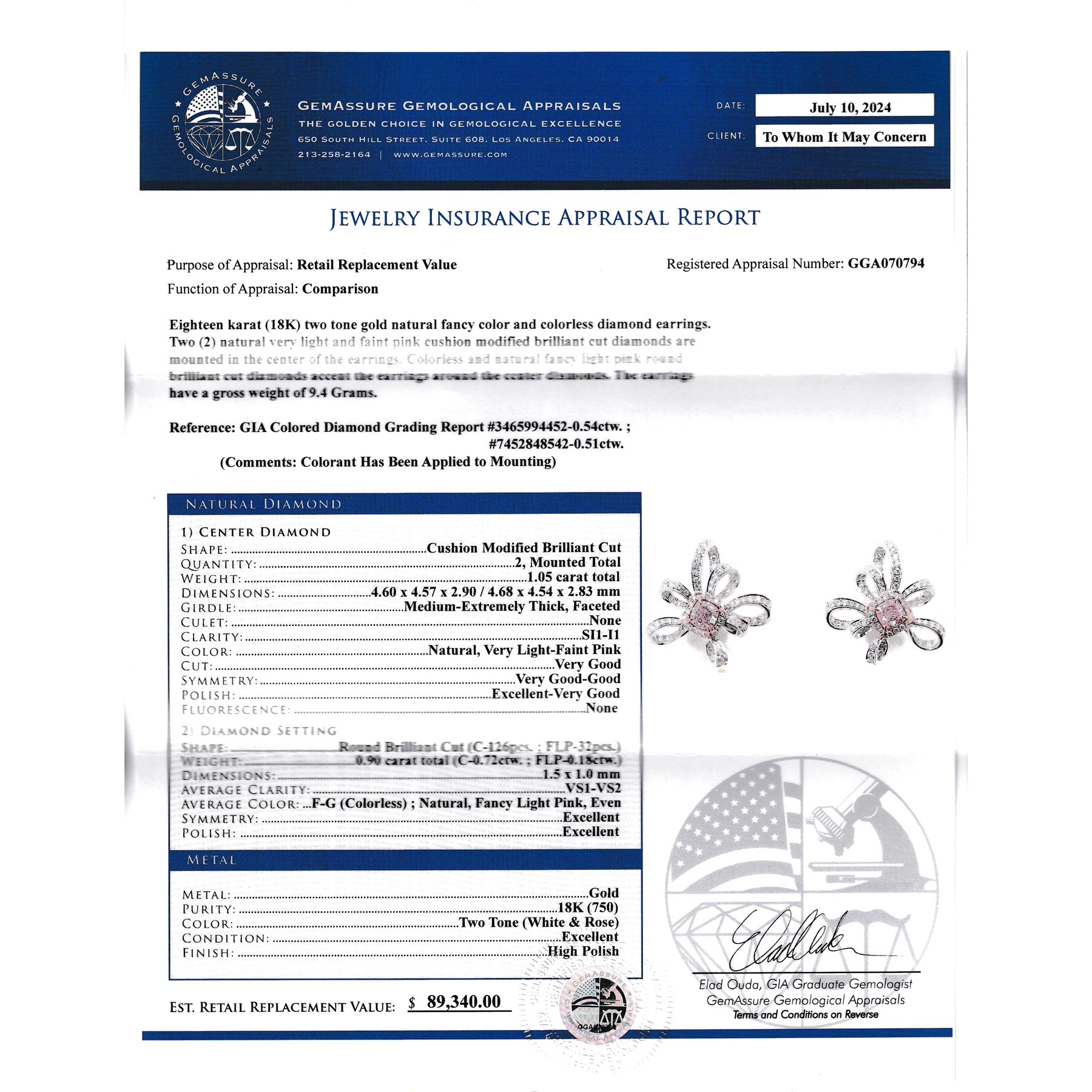 APPRAISAL REPORT: GIA graded & amp; GGA appraised this item with an estimated retail replacement value of $89,340.00.