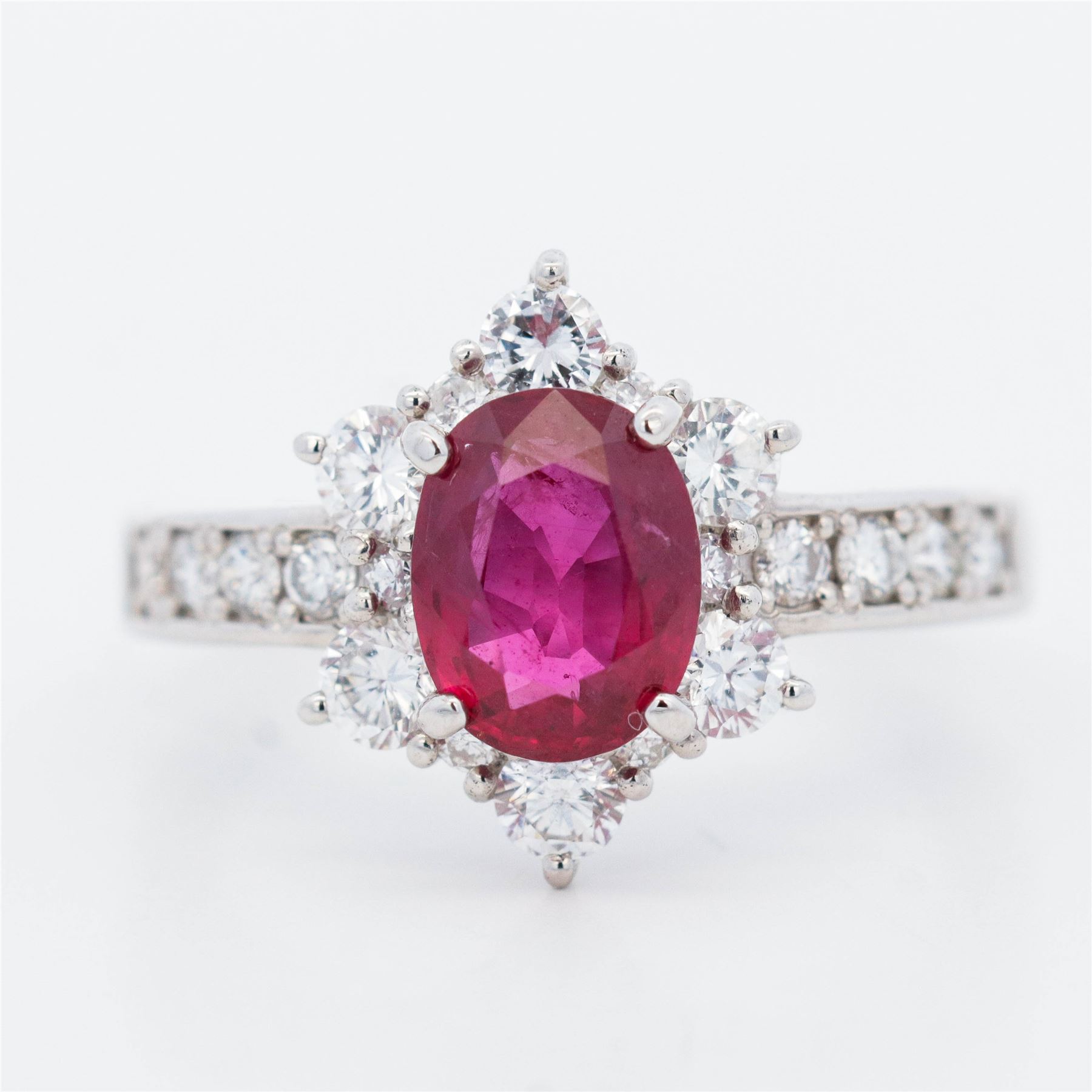 Platinum 900 ring with GIA-certified 1.40ct Natural Thai Ruby Center Stone. Oval Brilliant Step Cut Transparent Red Natural Corundum. With numerous near-colorless round brilliants totaling .74cts.