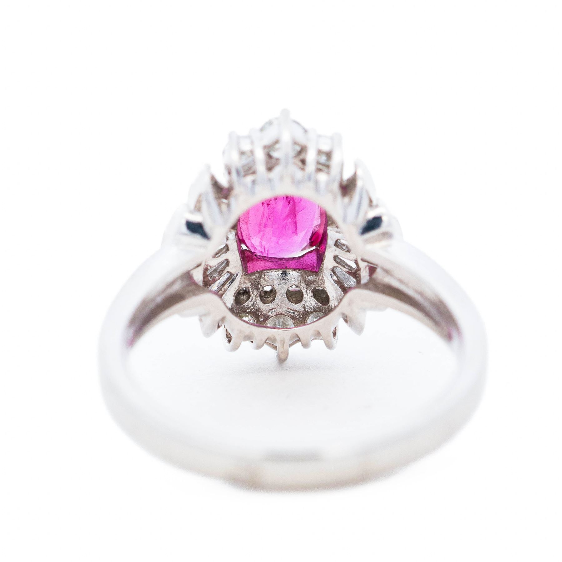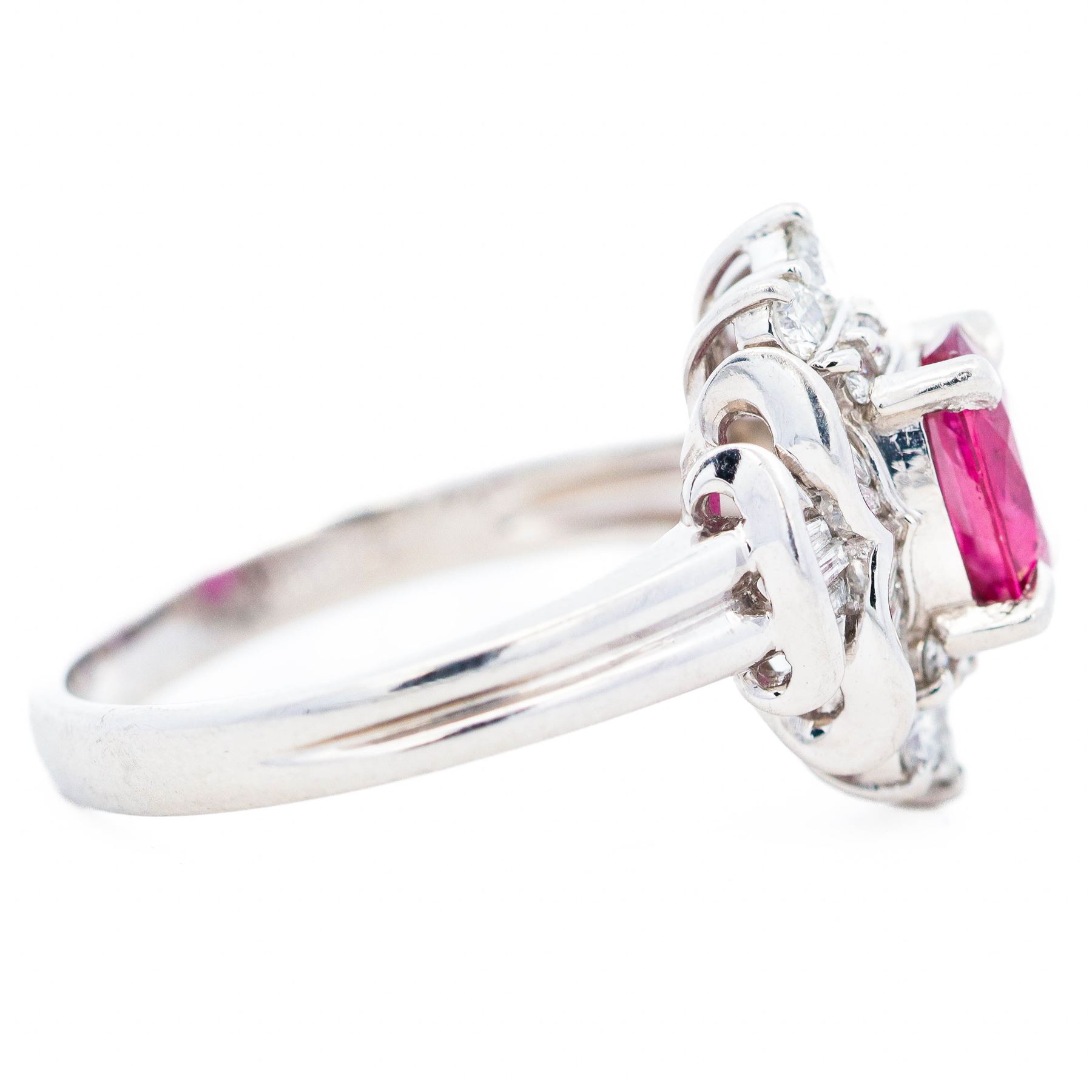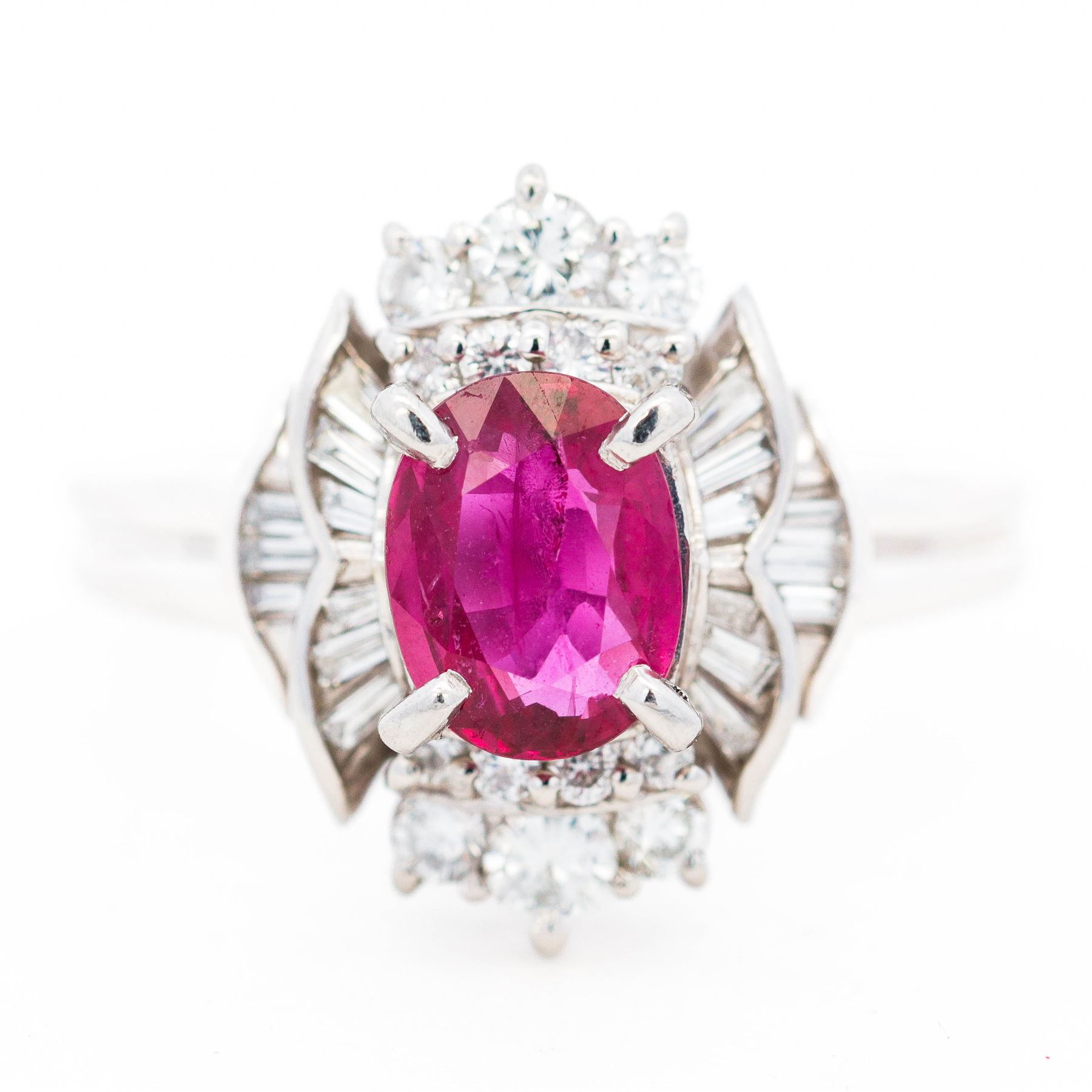 Purplish red transparent natural thai ruby 1.44cts set in a platinum ring with numerous near-colorless round brilliants and tapered baguettes (0.62ctw)