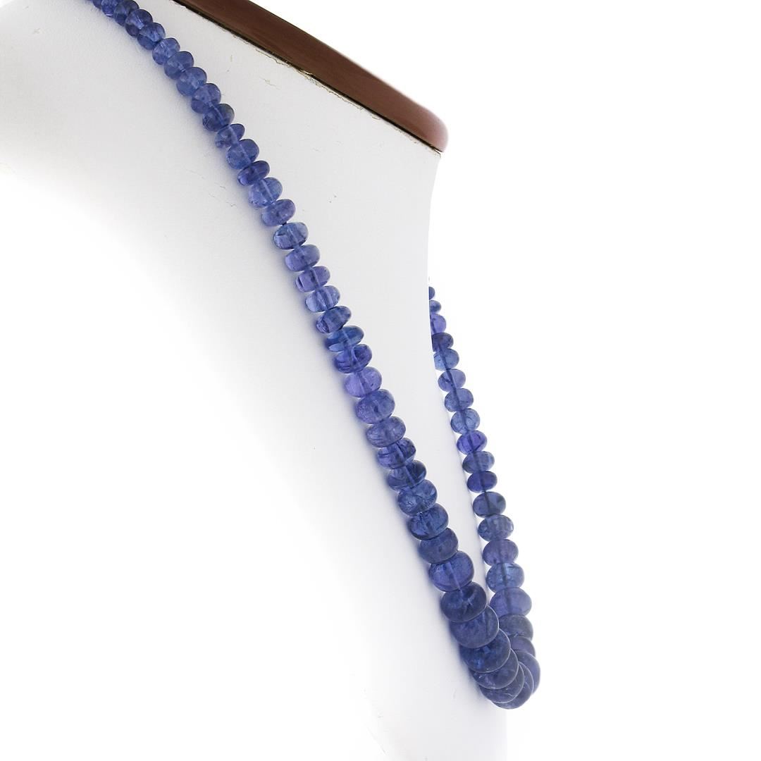 A bead strand necklace with 14k white gold chain & clasp, featuring GIA graded 101 rondelle bead shape natural tanzanites (). It weighs a total of 32.90 grams, measures 10.3mm wide, and measures 18.5 inches in length. Comes with all original relevant certifications.