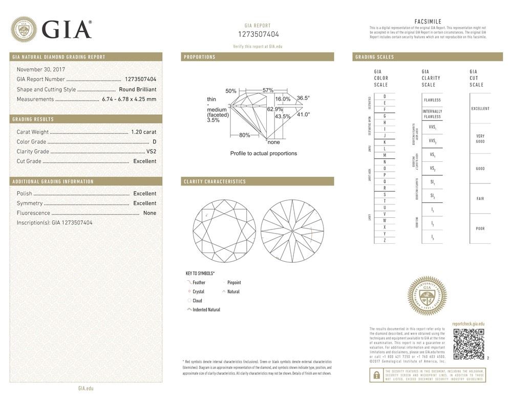 GIA/Round/D/VS2/1.2ct/EX/EX/EX/Dimension - 6.78 x 6.74 x 4.25/GIA# 1273507404/#R66357