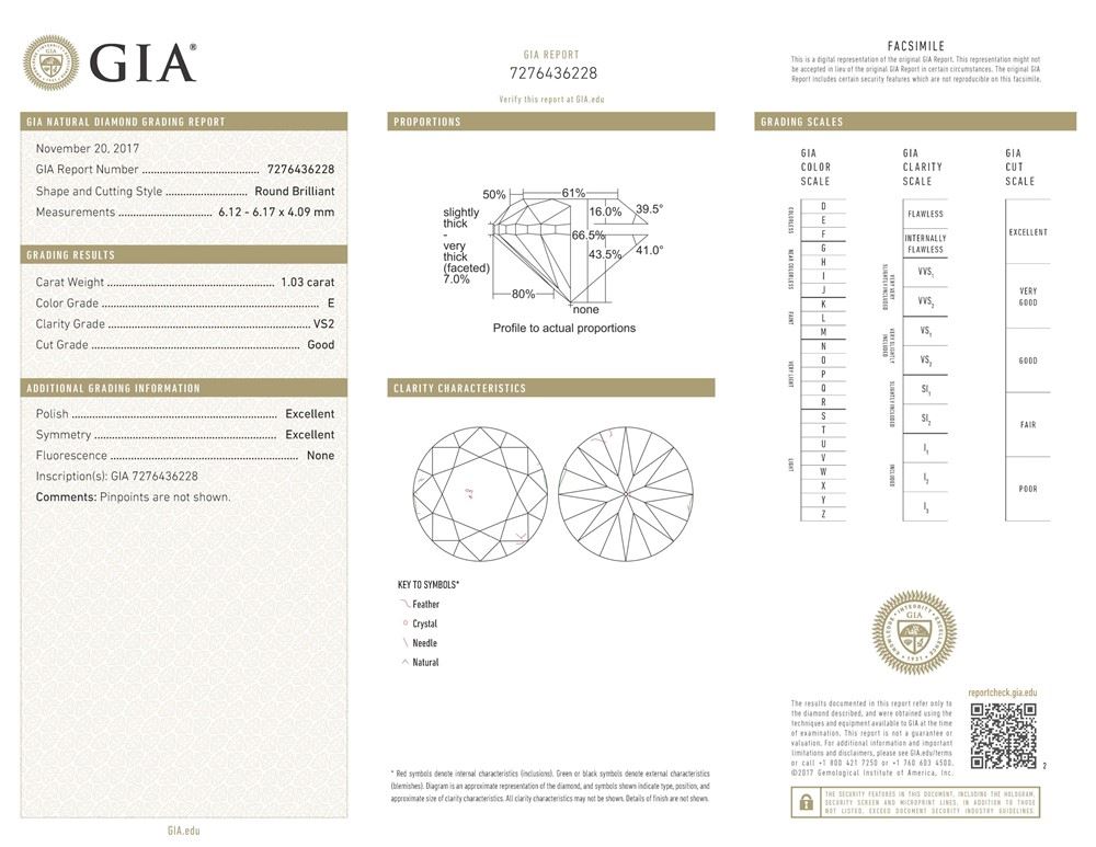 GIA/Round/E/VS2/1.03ct/GD/EX/EX/Dimension - 6.17 x 6.12 x 4.09/GIA# 7276436228/#R66102