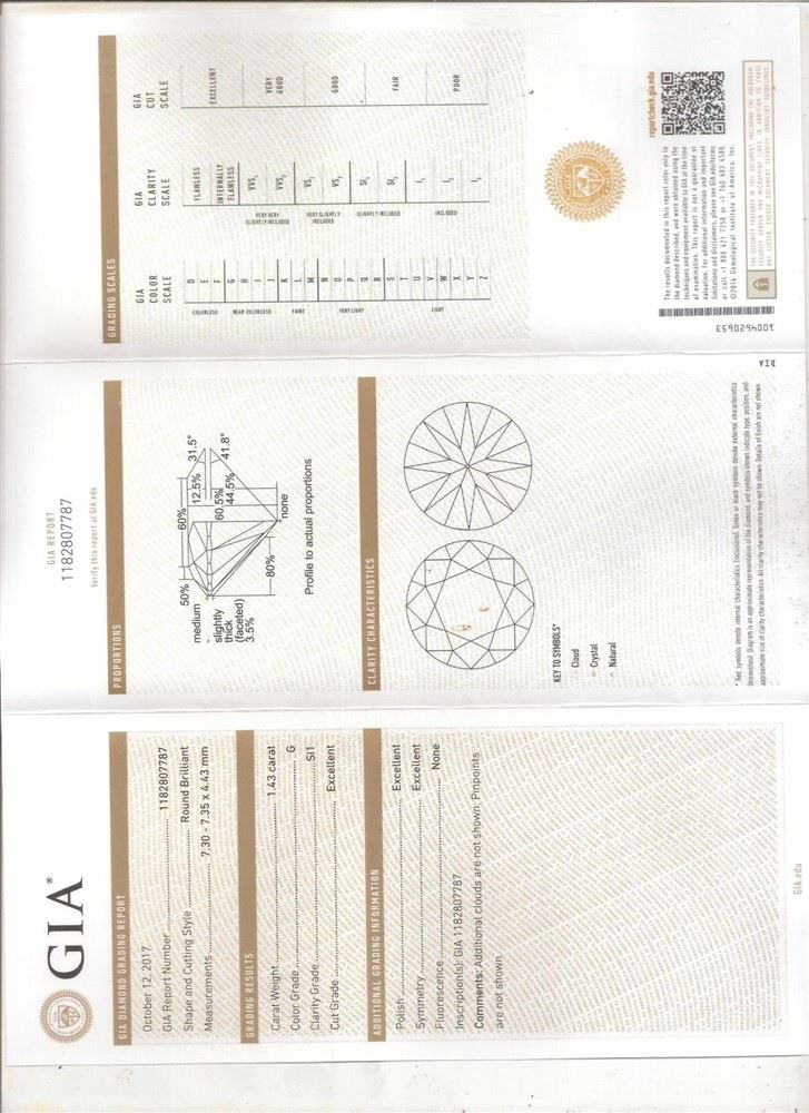 GIA/Round/G/SI1/1.43ct/EX/EX/EX/Dimension - 7.35 x 7.3 x 4.43/GIA# 1182807787/#R43464