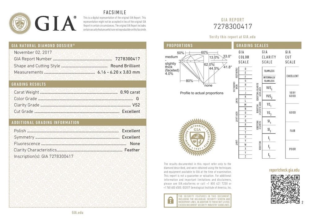 GIA/Round/G/VS2/0.9ct/EX/EX/EX/Dimension - 6.2 x 6.16 x 3.83/GIA# 7278300417/#R65816