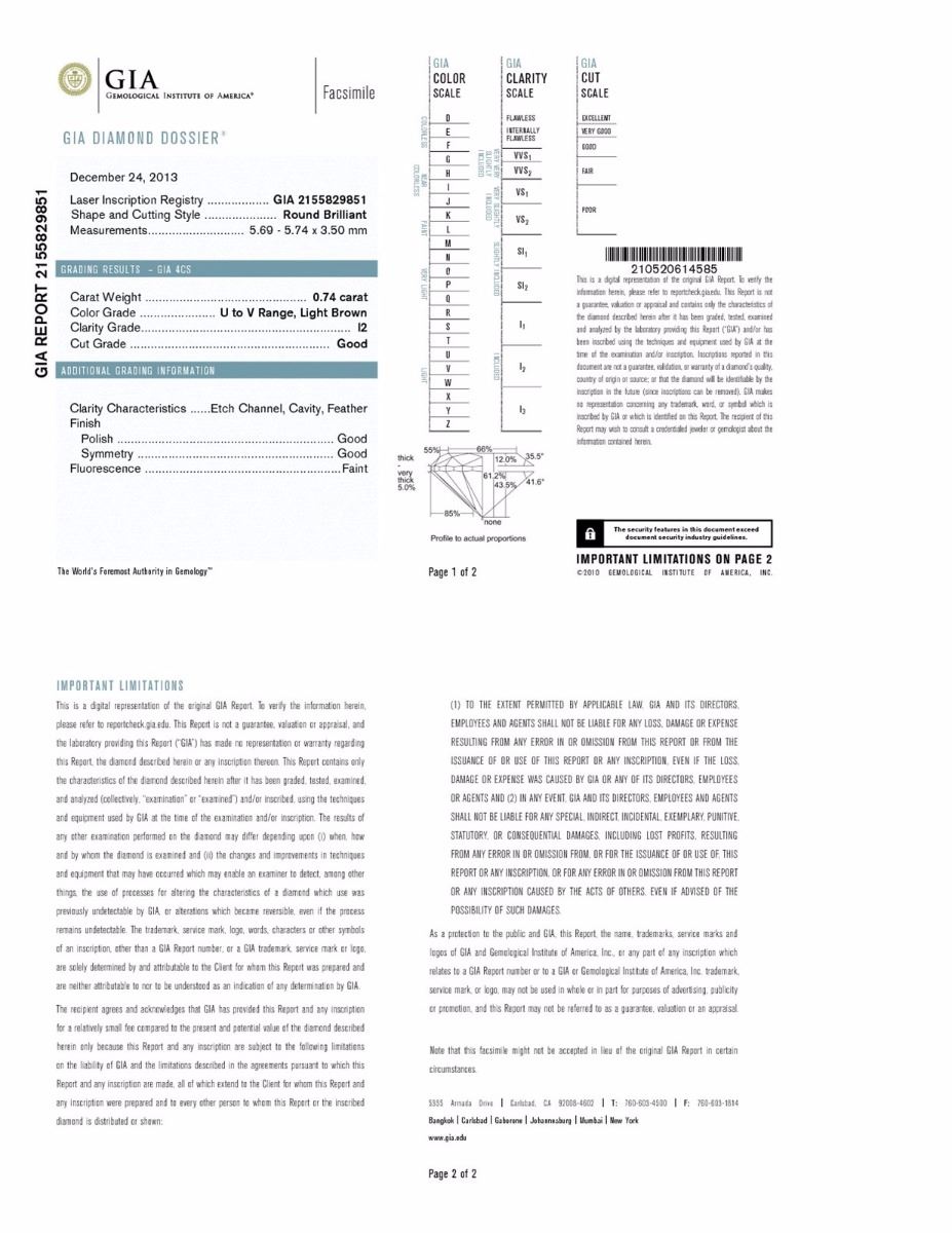 GIA/Round/U/I2/0.74ct/GD/GD/2155829851/#SS-4983