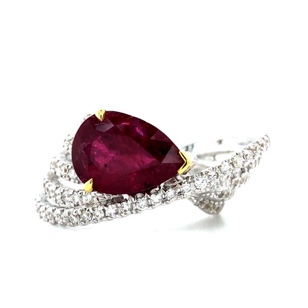 DESCRIPTION DETAIL: Rubies from Mozambique are rapidly gaining recognition as the best gem quality rubies on the market today. Several of the most prominent jewelry and design houses in the world are now using rubies from Mozambique in their High Jewelry Collections. This pear-cut, unheated Mozambique ruby is set in an East-West orient, in a white gold ring, using yellow gold claw prongs and one V-prong. Additionally, there are round, brilliant-cut diamonds that are prong-set along the multiple ribbons of the shoulders that flow in an & quot;elliptical wave& quot; pattern, meeting at the bottom to form a single shank that measures approximately 2.1 mm. This ring is incredibly comfortable on the finger, as there are no & quot;sharp& quot; parts.