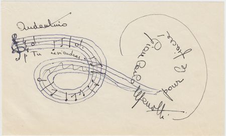 (1911 - 2007) Italian operatic composer and librettist whose works derive from Puccini and Mascagni. Fine and unusual A.M.Q.S. penned on a 7" x 4 1/2" sheet, a spiral drawing of one measure of music in blue ink marked "Andantino", inscribed in black ink to "the cab" and signed upside down. A curious, quirky and beautiful item, fine condition.