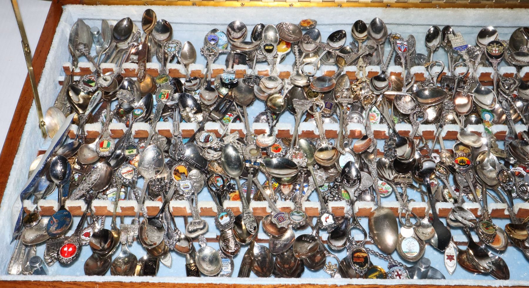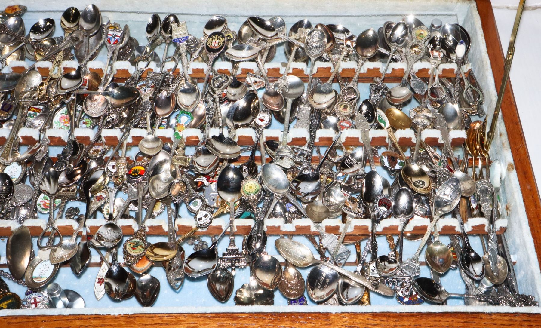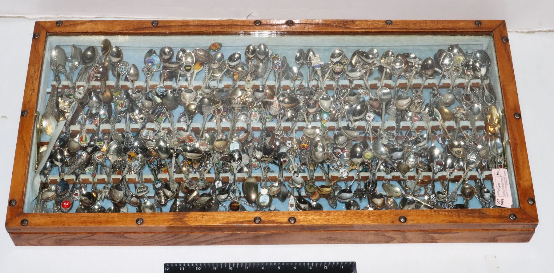GIANT LOT OF COLLECTIBLE SPOONS ON WOOD DISPLAY