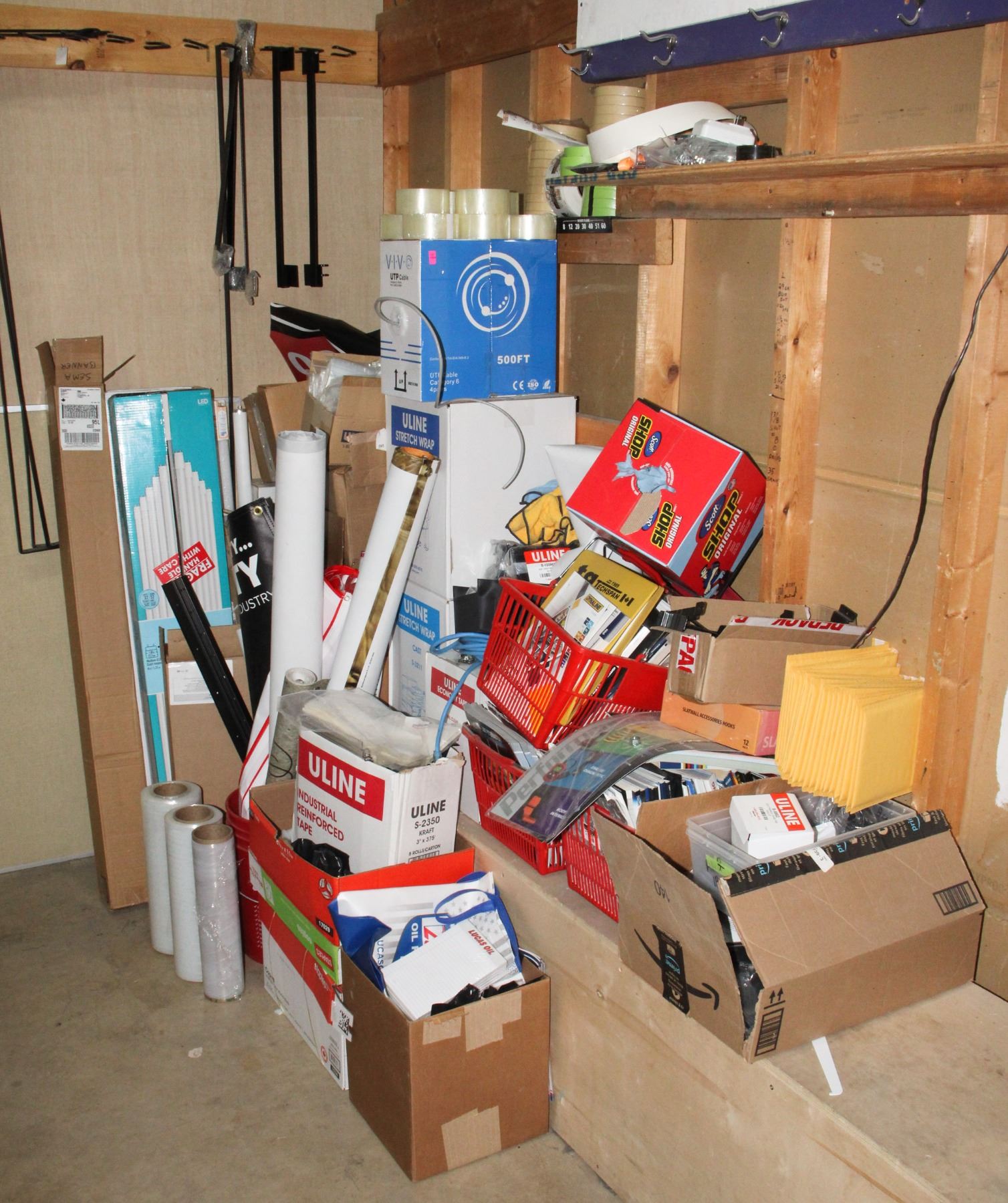 GARBAGE BAGS, EXTENSION CABLE, STRETCH WRAP, PRINTER PAPER, LIGHT BULBS, CAT 6 CABLE, TAPE. SOME NEW SOME USED. MUST TAKE ALL