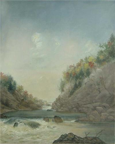 GIBEON BRADBURY (American, 1833-1904) "SALMON FALLS, ON THE SACO 1889". Unframed oil on canvas scene shows a narrow gorge with a small mill in background and a cascading pool below. The edges of rocks have colorful trees under a blue and pink sky. Titled and signed on back "G.E.B. 1889". SIZE: 24" x 18-1/2". CONDITION: Very good. 9-27210