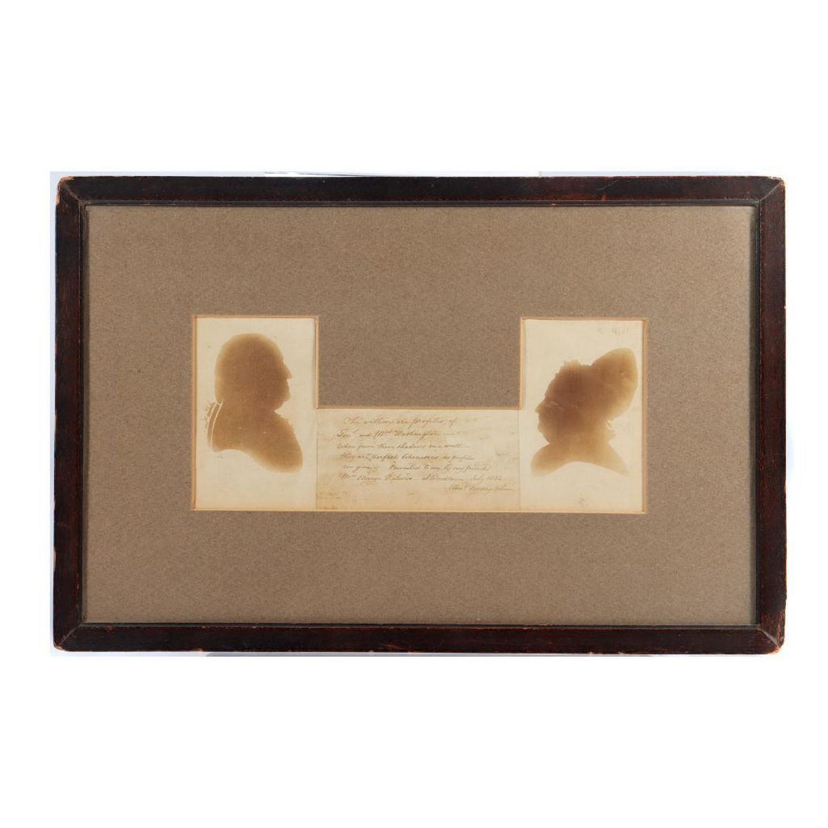 A pair of silhouette profiles of George and Martha Washington, with an accompanying, signed note that reads: "The within are profiles of Gen'l and Mrs. Washington--taken from their shadow on a wall--they are as perfect likenesses as profiles can give-- Presented to me by my friend Mrs. Eleanor P. Lewis -- at Woodlawn -- July 1832. Eliza.th Bordley Gibson." Each image: 3 1/4in. x 2 1/8in. (sight). Note: 2in. x 3in. (sight). Frame: 8 1/4in. x 12 1/8in. Condition: Toning; the silhouettes are faded; fading and soiling to the note. Elizabeth Bordley Gibson was the daughter of John Beal and Sarah Bordley, Annapolis, Maryland, who were family friends of the Washingtons. Eleanor Parke Custis Lewis (1779-1852) was the youngest granddaughter of Martha Washington and the step-granddaughter of George Washington. She lived at Woodlawn Plantation when it was completed in 1805.