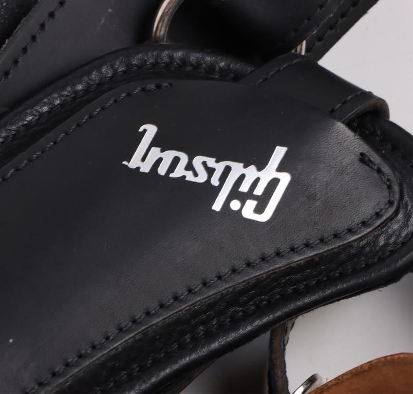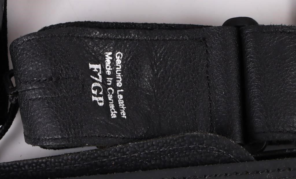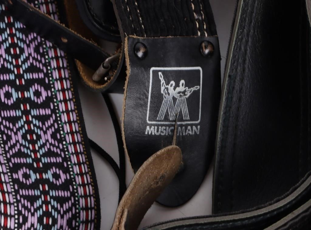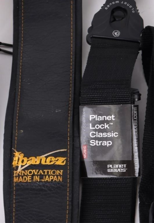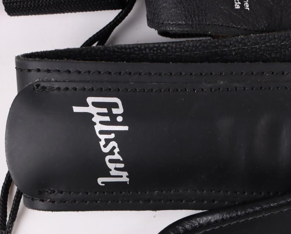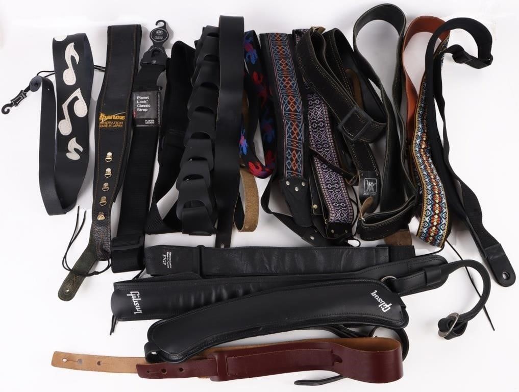 Gibson and more leather and nylon guitar straps to include two heavy duty Gibson leather straps, one nylon Gibson strap, two Music Man leather straps, one Guild leather embroidered strap, two non-name leather embroidered straps, one Gretsch leather strap, one Earie Ball leather and nylon strap, one Planet Waves nylon strap, one heavy duty Ibanez Japanese leather strap, one Gibson leather strap, three non-name leather straps, one D'Addario nylon strap, and one Levy's leather strap.