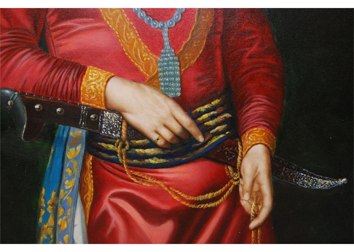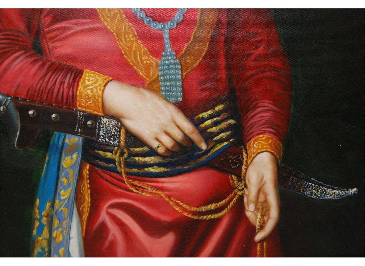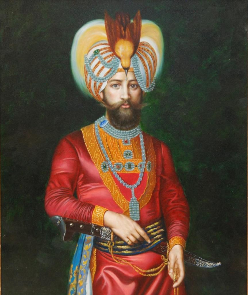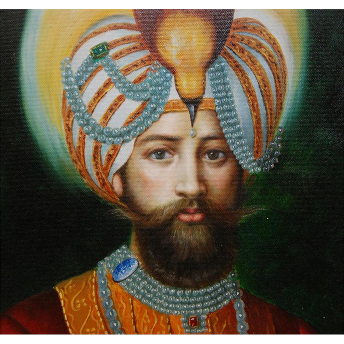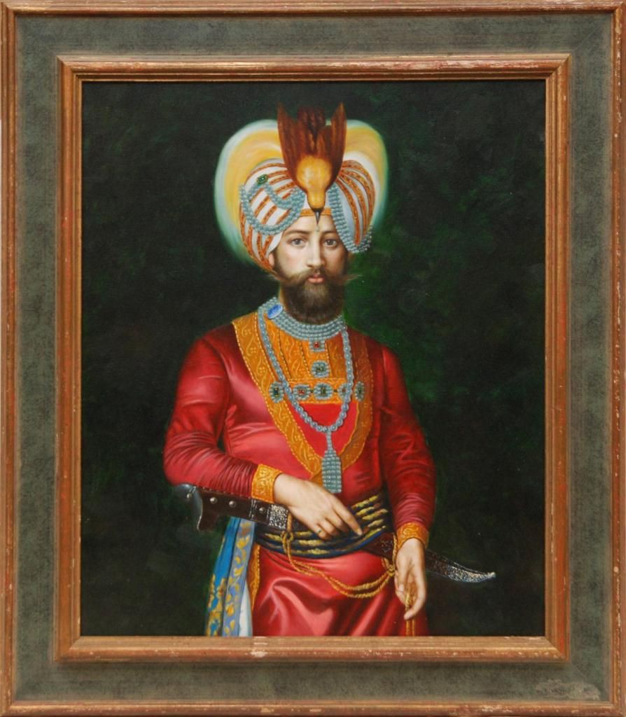 Giclee on canvas depicting a Mughal prince. Mounted in wooden frame. Measures 23 1/4" height x 19 1/4" width + 3 1/2" frame (59cm x 48.8cm + 8.9cm).