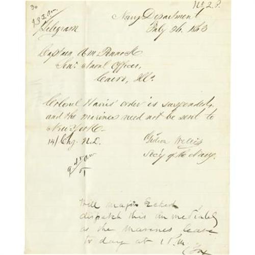 <B>GIDEON WELLES: HISTORIC CIVIL WAR-DATE MILITARY LETTER SIGNED.</B></I> One page, quarto, dated July 26, 1863 from the Navy Department. Written to <I>“Capt. Alexander M. Pennock, Snr. Naval Officer, Cairo, Ill.”</B></I> (Capt. Pennock finished his military career at the rank of rear admiral 1872 , and died on Sept. 20, 1876.) A handwritten telegram, the order reads (in full): <I><BR><BR>“Colonel Harris’ order is suspended, and the marines need not be sent to New York. Gideon Welles, Sec’y of the Navy. Will Major Eckert dispatch this immediately as the marines leave to day at 1 p.m. C. Fox”.</B></I><BR><BR>“The nation is at this time in a state of Revolution, North, South, East, and West,” wrote the <I>Washington Times</B></I> during the often violent protests that occurred after Abraham Lincoln issued the March 3, 1863, Enrollment Act of Conscription. Although demonstrations took place in many Northern cities, the riots that broke out in New York City were both the most violent and the most publicized. <BR><BR>With a large and powerful Democratic party operating in the city, a dramatic show of dissent had been long in the making. The state’s popular governor, Democrat Horatio Seymour, openly despised Lincoln and his policies. In addition, the Enrollment Act shocked a population already tired of the two-year-old war.<BR><BR>By the time the names of the first draftees were drawn in New York City on July 11, reports about the carnage of Gettysburg had been published in city papers. Lincoln’s call for 300,000 more young men to fight a seemingly endless war frightened even those who supported the Union cause. Moreover, the Enrollment Act contained several exemptions, including the payment of a “commutation fee” that allowed wealthier and more influential citizens to buy their way out of service. <BR><BR>Perhaps no group was more resentful of these inequities than the Irish immigrants populating the slums of northeastern cities. Poor and more than a little prejudiced against blacks - with whom they were both unfamiliar and forced to compete for the lowest-paying jobs - the Irish in New York objected to fighting on their behalf. <BR><BR>On Sunday, June 12, the names of the draftees drawn the day before by the Provost Marshall were published in newspapers. Within hours, groups of irate citizens, many of them Irish immigrants, banded together across the city. Eventually numbering some 50,000 people, the mob terrorized neighborhoods on the East Side of New York for three days looting scores of stores. Blacks were the targets of most attacks on citizens. In all, the mob caused more than $1.5 million of damage. The number killed or wounded during the riot is unknown, but estimates range from two dozen to nearly 100. Eventually, Lincoln deployed combat troops from the Federal Army of the Potomac to restore order; they remained encamped around the city for several weeks. <BR><BR>A great letter from the Secretary of the Navy, in which he directs a group of Marines from Illinois to stand-down after the riots had been sufficiently suppressed. That Welles believed the unrest serious enough to call up troops all the way from Illinois is a testament to the gravity of the situation. In fine condition. <BR><BR><b>Shipping:</b> Flat Material, Small (<a target="_blank" href="http://www.heritageauctions.com/common/shipping.php">view shipping information</a>)