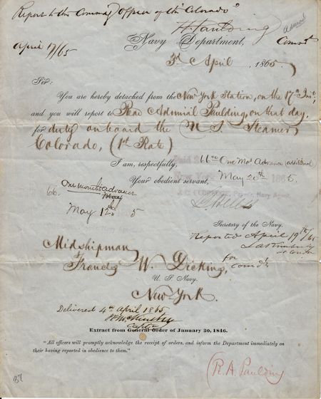 (1802-1878) Lincoln's Secretary of the Navy who proposed the blockage of Southern ports and the construction of the ironclad fleet. War-date L.S., 1p. 4to., Apr. 17, 1865, an order to a midshipman to report to Rear Adm. HIRAM PAULDING, signed by Welles at center, also signed twice by Paulding.