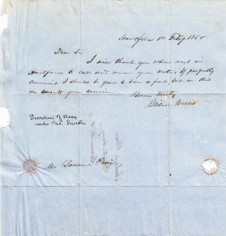(1802-1878) Lincoln's Secretary of the Navy who proposed the blockade of Southern ports and the construction of an ironclad fleet. A.L.S. 1p. 4to., Hartford, Feb. 1, 1850, to Samuel Price, in part: "...I will thank you when next in Hartford to call...If perfectly convenient...".