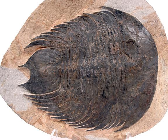 GIGANTIC DIKELOKEPHALONAS TRILOBITE. Dikelokephalonas is one of rarer 475 million year old trilobites found in Morocco and also one of the largest. This complete trilobite is 10.5 x 9.25 inches and is nicely centered on a 13.5 x 12 inch beige and gray matrix. Dikelokephalonas can be identified by the odd shaped pair of tail spines on its pygidium. The detail on this trilobite is sharp and clear with the only defect being a crack in the matrix running through the right part of the head of the trilobite that has been professionally repaired and is barely noticeable. All in all this is a premium quality specimen that is seldom found better preserved.